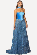 A captivating design by Vlora & Kaltrina, this ethereal gown is crafted to make a lasting impression. Featuring a strapless, sculpted silhouette, the dress flows into a voluminous, floor-length skirt adorned with intricate shimmering embellishments that catch the light with every movement. The soft blue tones and textured finish create a dreamy, almost liquid-like effect, perfect for statement evening wear or special occasions.