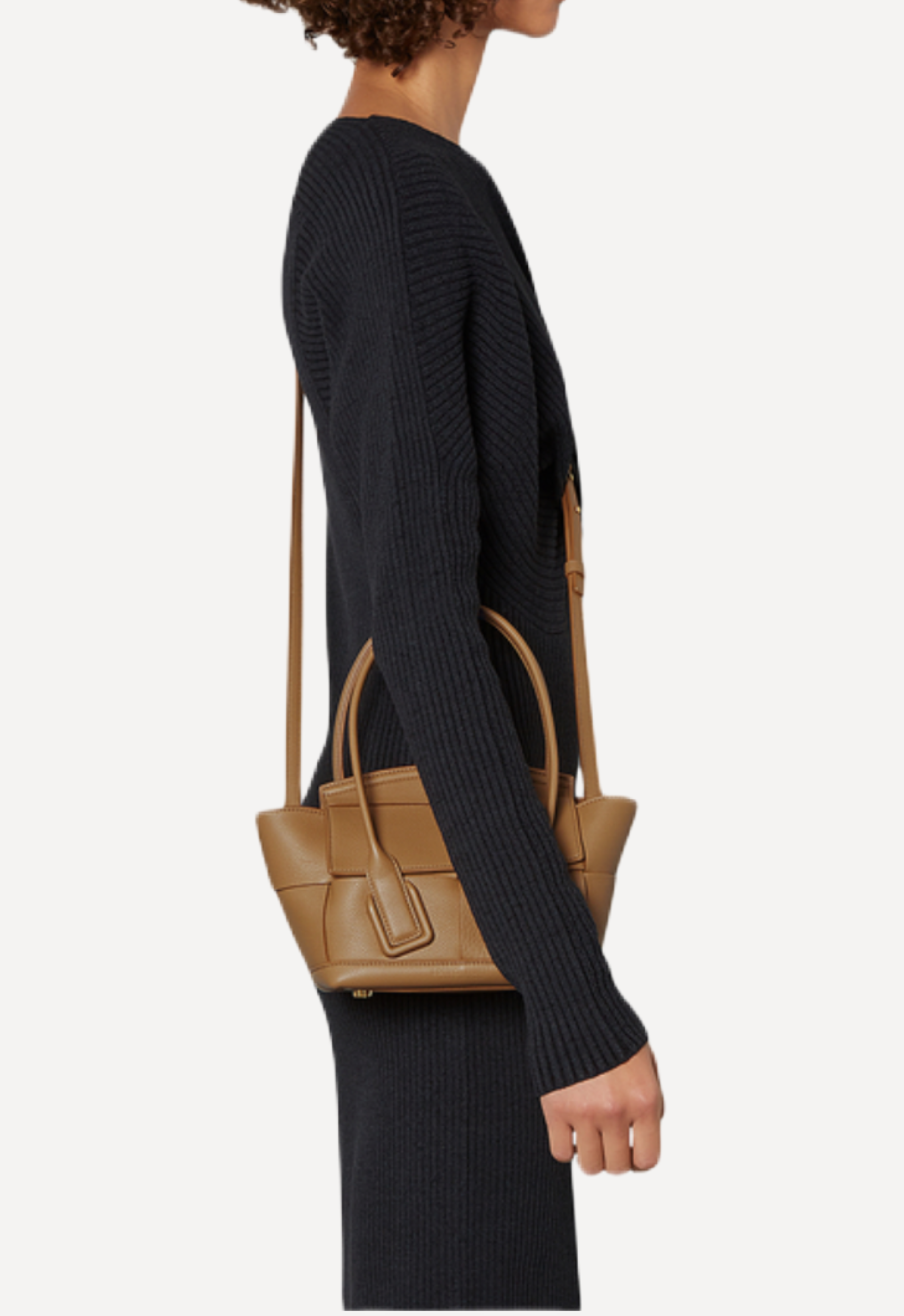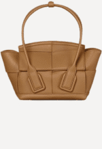 Crafted from French calf leather. This top-handle features an orthogonal maxi weave, an arc-shaped top panel with curved handles, rolled leather handles secured with a snap-button leather loop, a finish of fine contrast saddle stitch, and bonded suede interior with one zipped pocket and two open pockets.