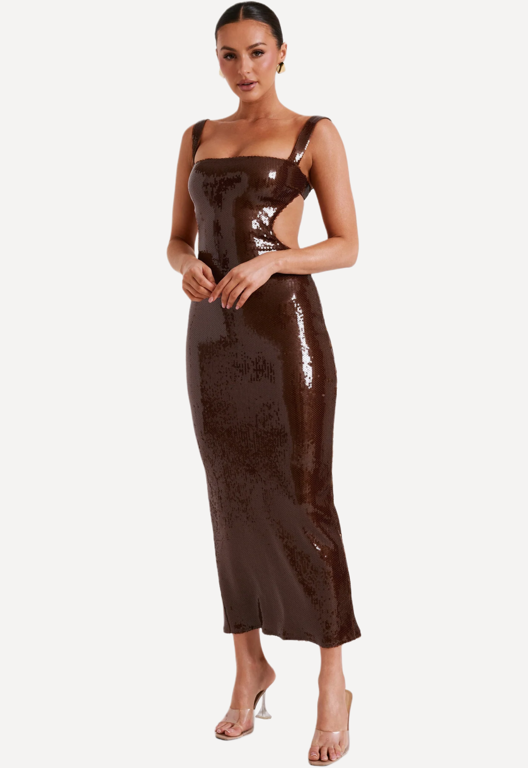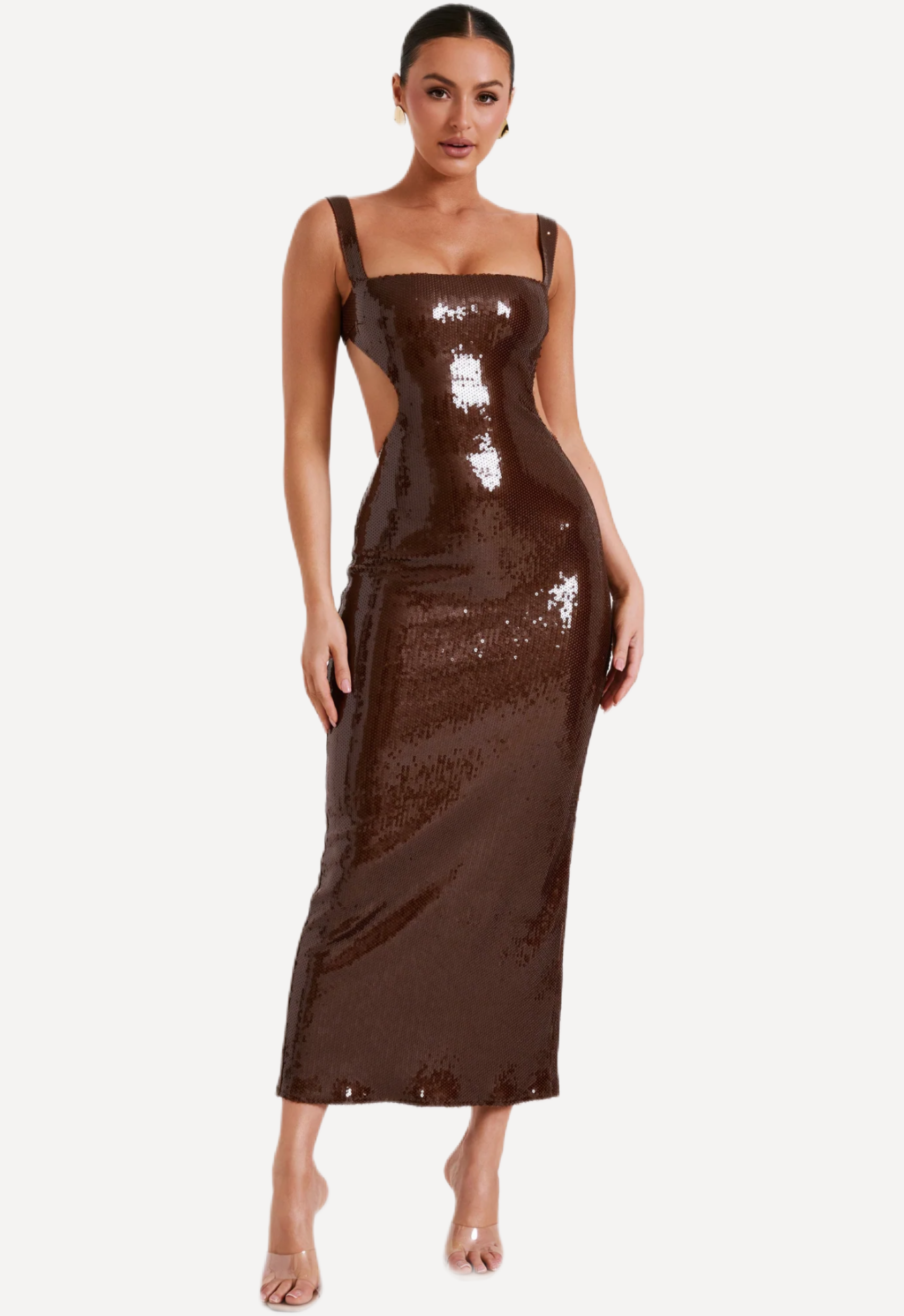 The Adoria sequin dress features side cutouts accentuating an alluring hourglass silhouette and it’s fully lined fabric offers a comfortable bodycon fit, closing with an invisible zipper at the center back.