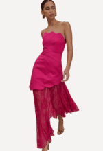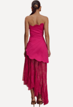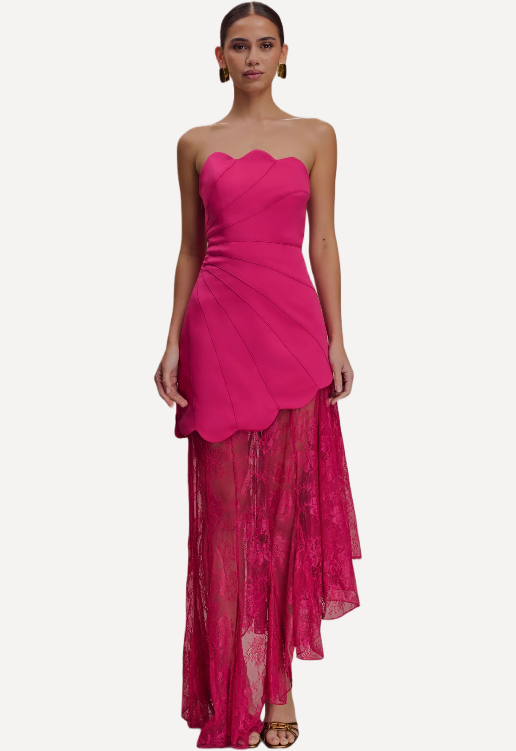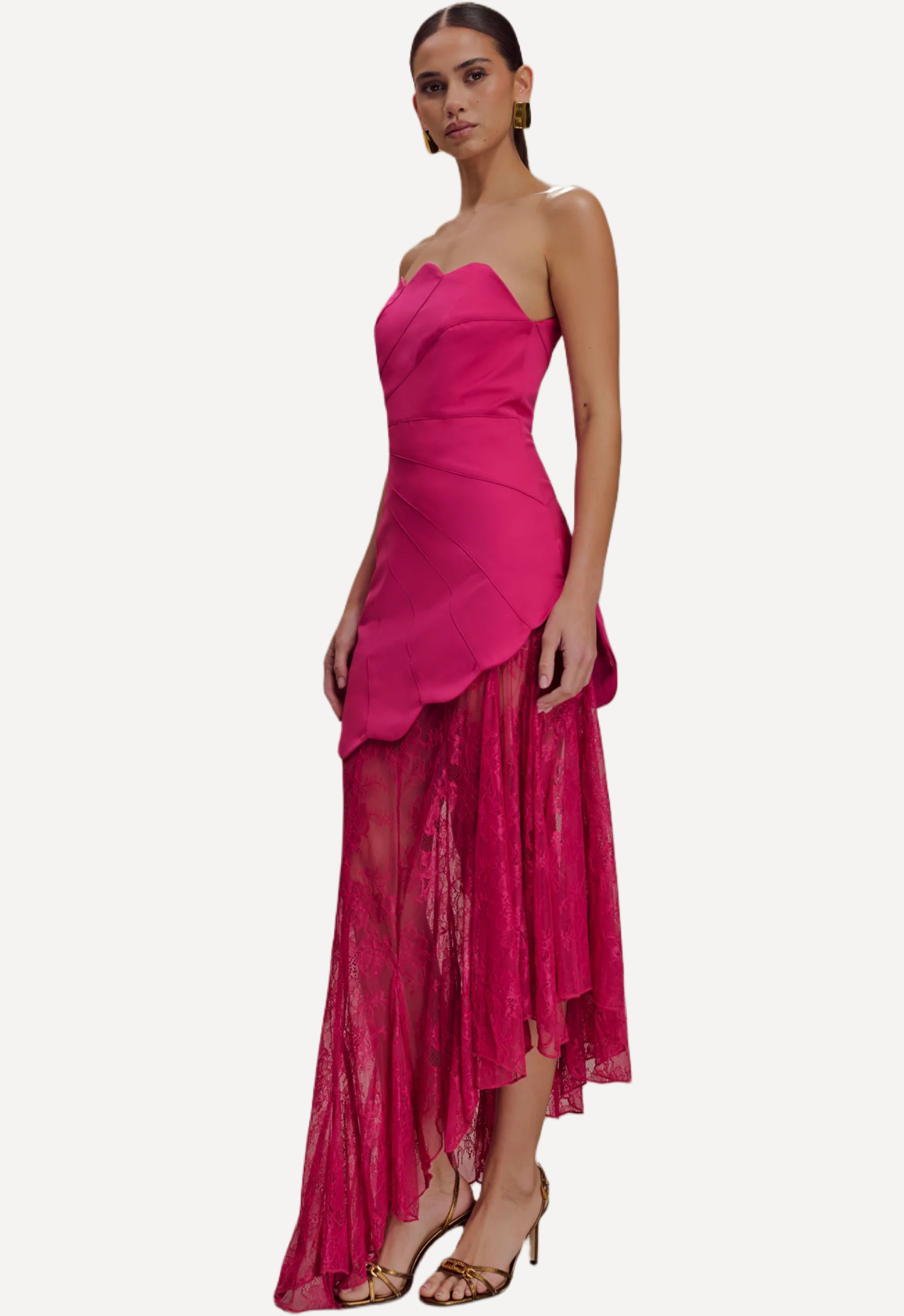 The Aleena Satin Lace Dress features a strapless silhouette with internal boning for structured support, a satin bodice and an unlined lace skirt maxi dress.