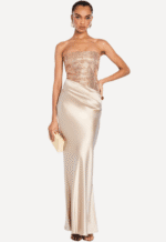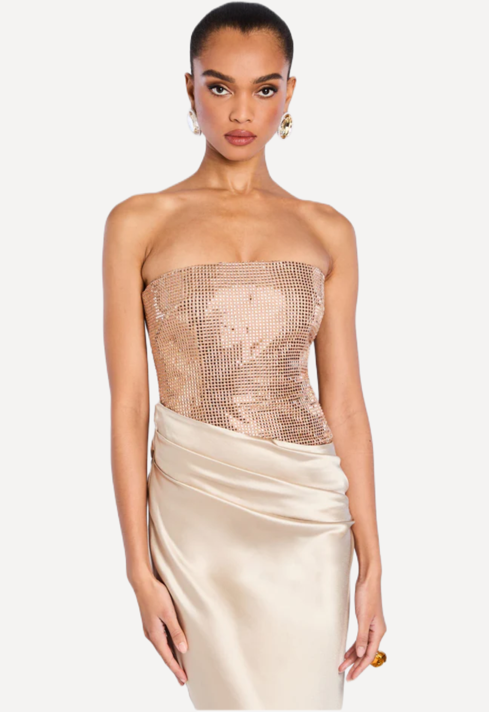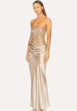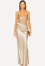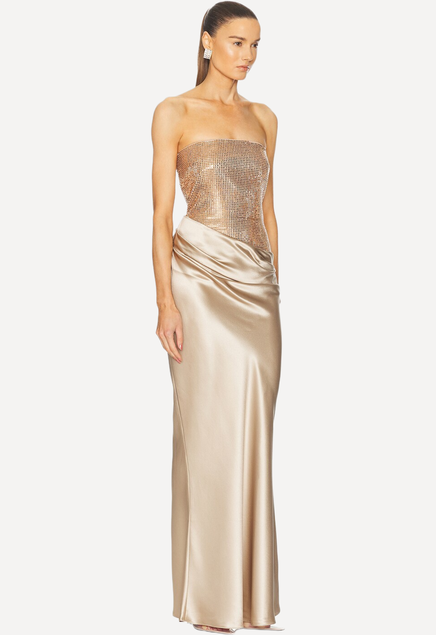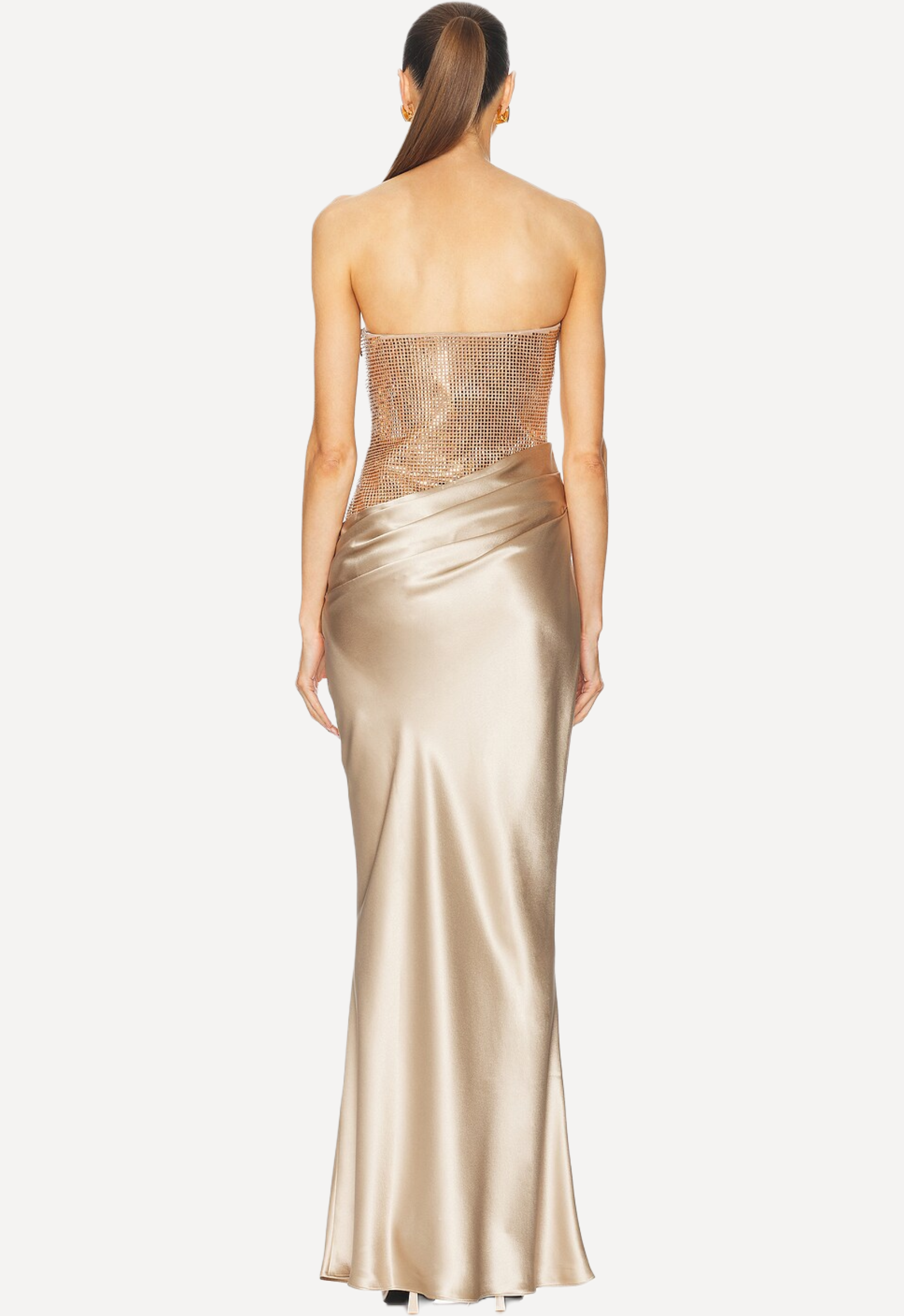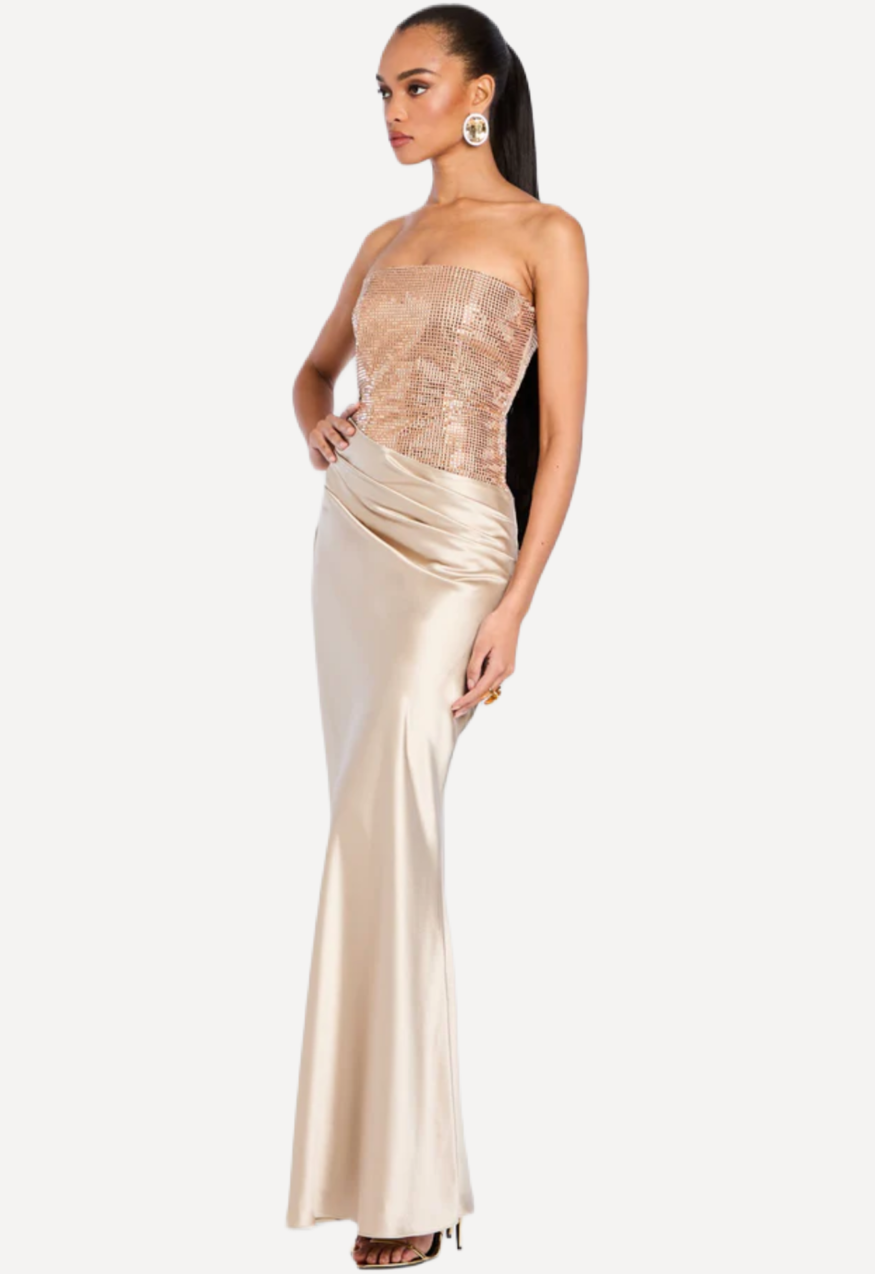 The Alexandra Sequin Draped Dress by Retrofete dazzles with its boned bodice, non-slip silicone grip trim, and rhinestone-embellished detail that flows into a sleek satin skirt.
