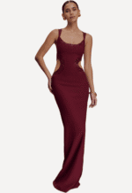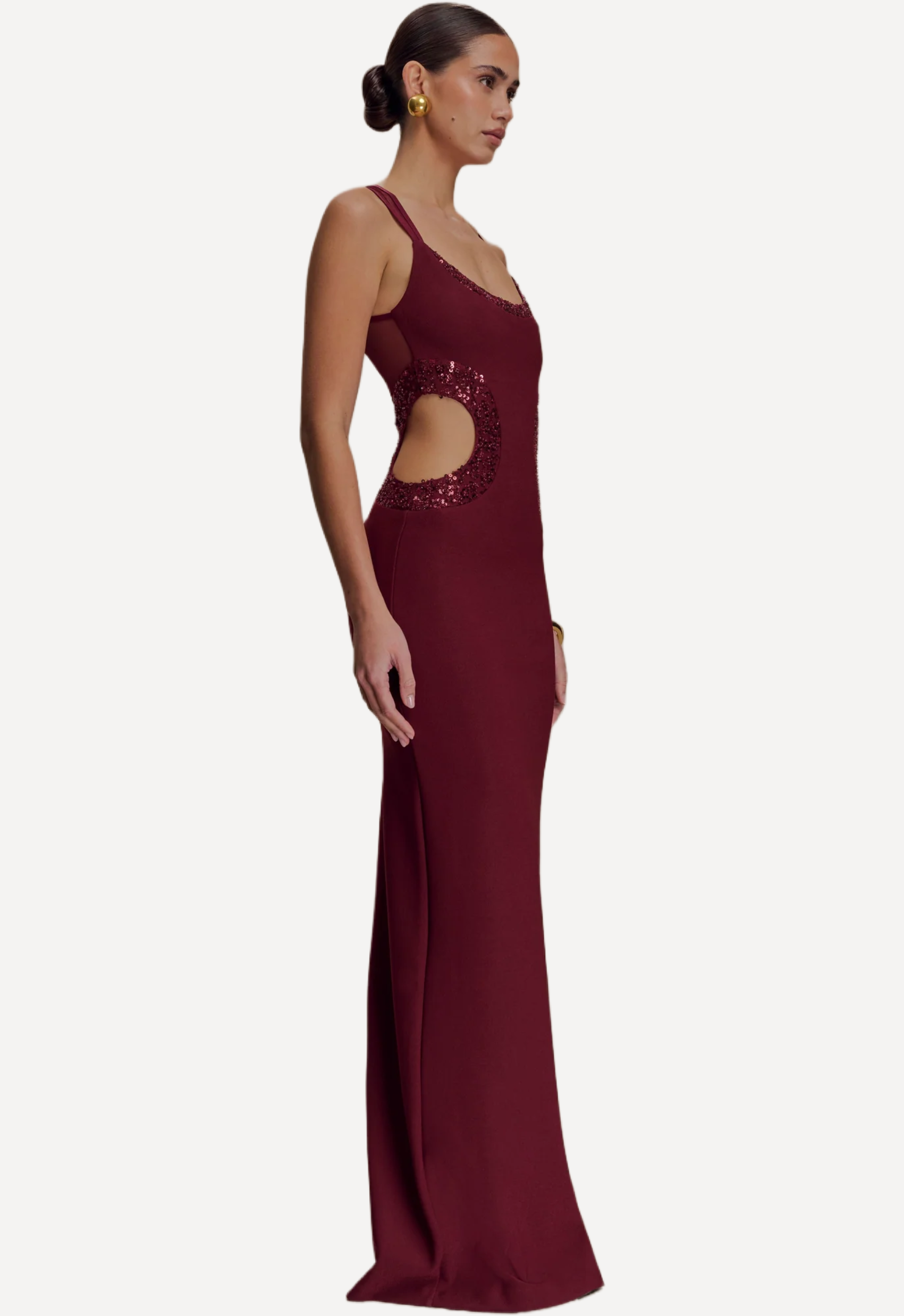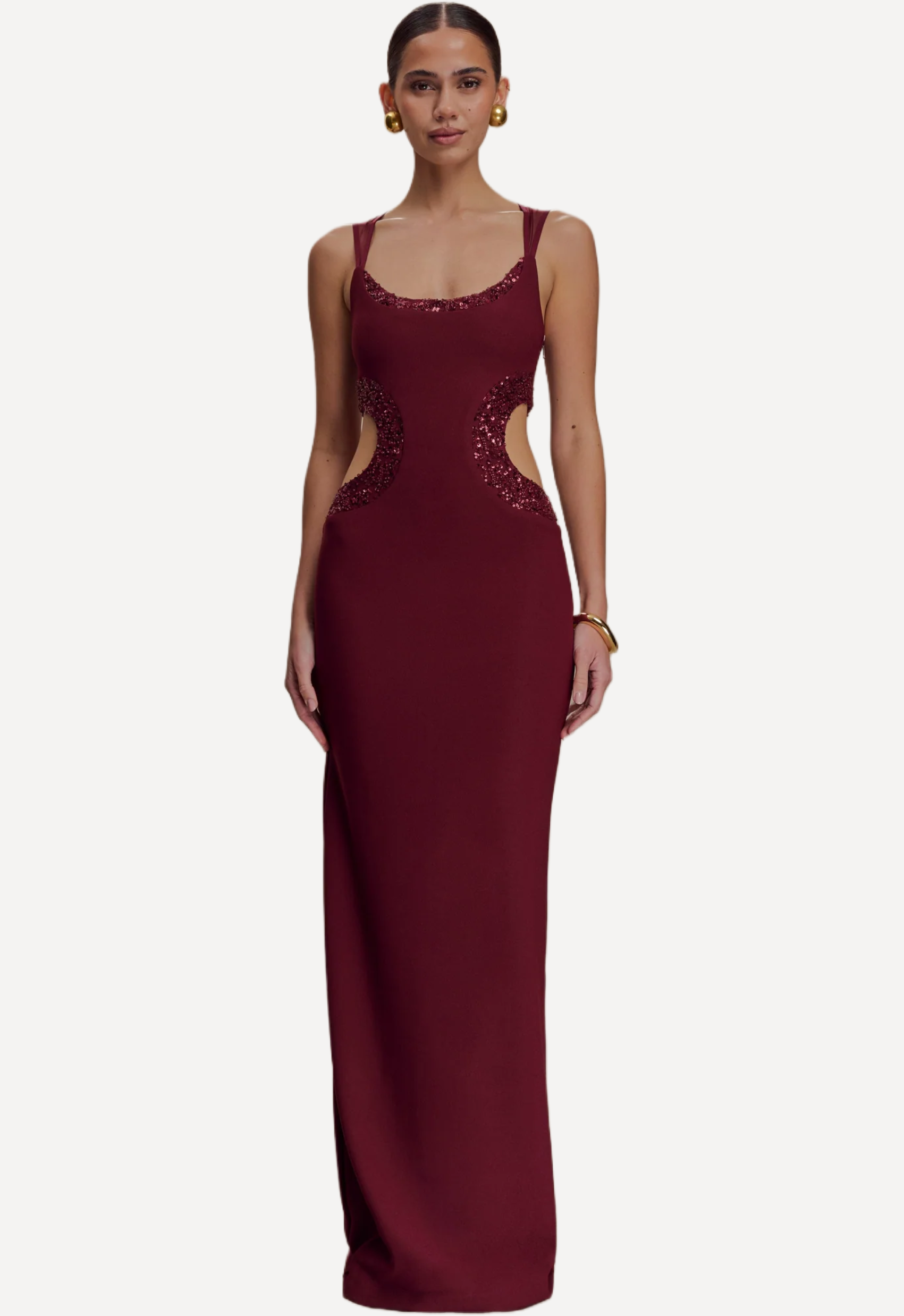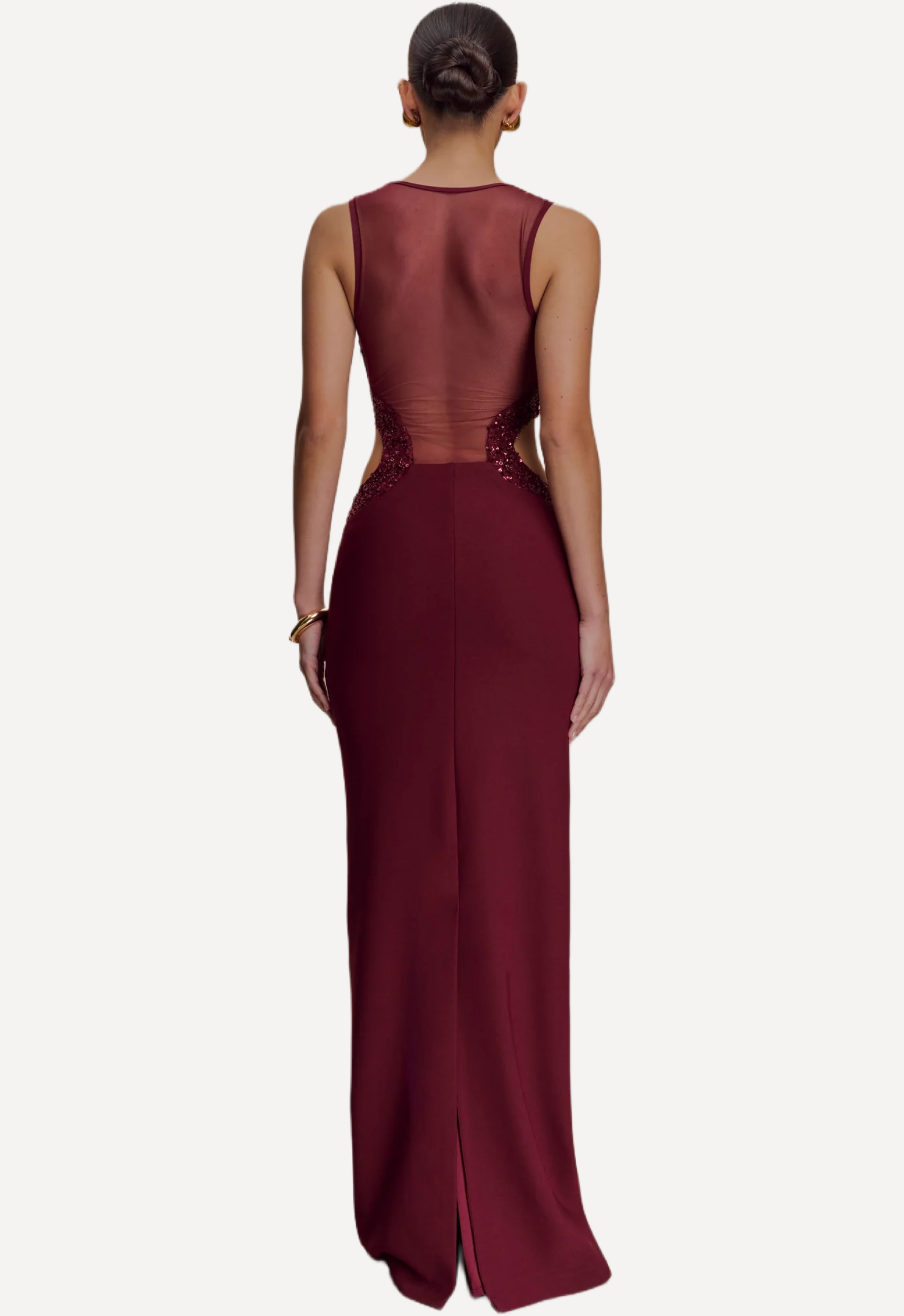 The Angelique Beaded Crepe Maxi Dress cut in a sculpting bodycon silhouette features a scoop neckline, waist cut outs and a sheer mesh back design.