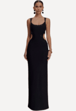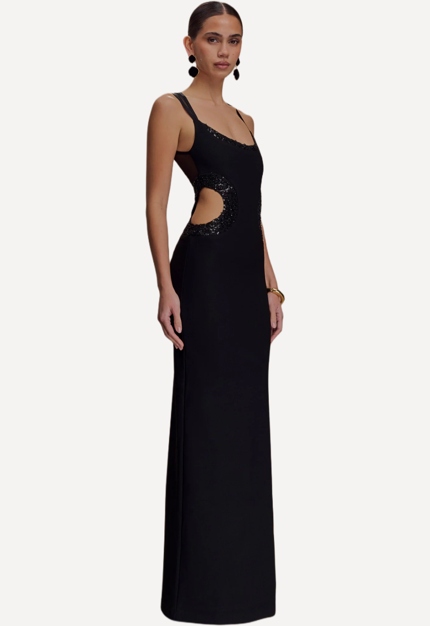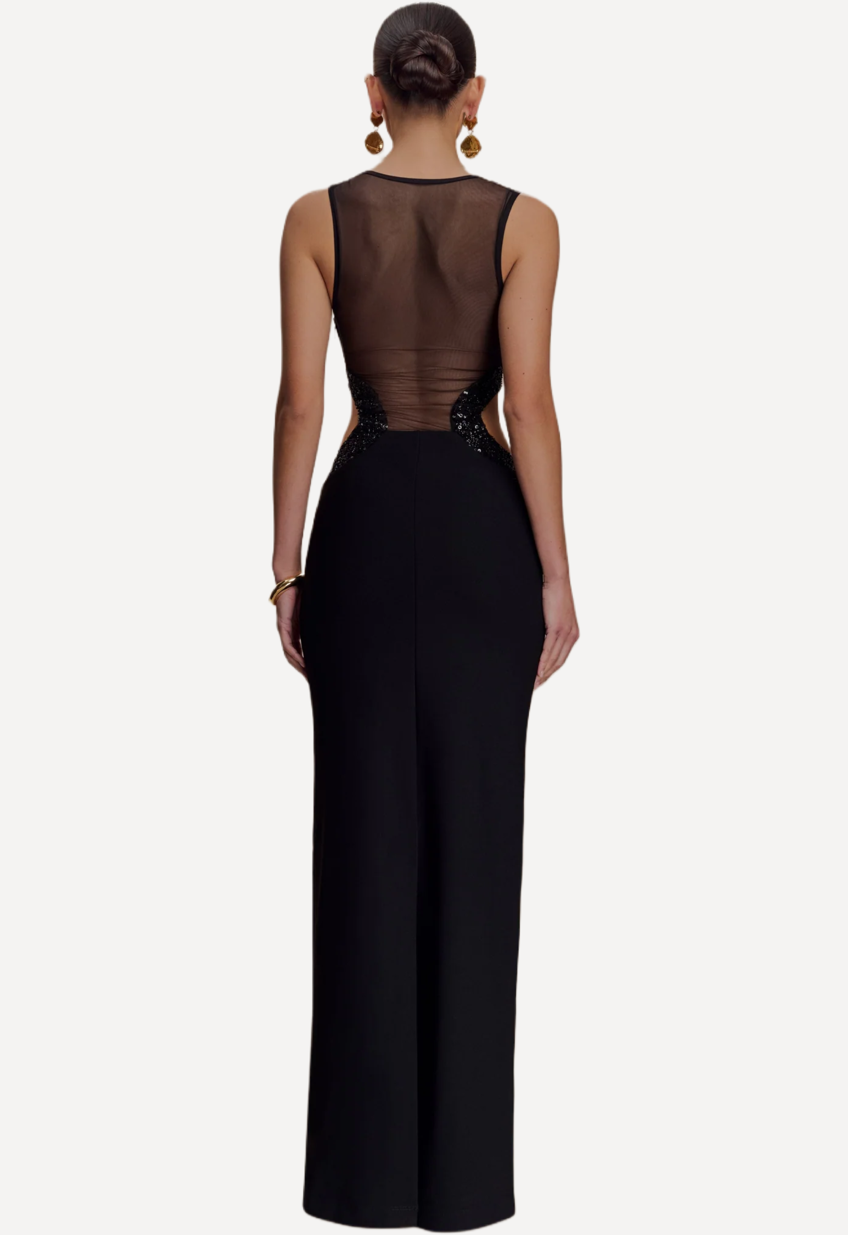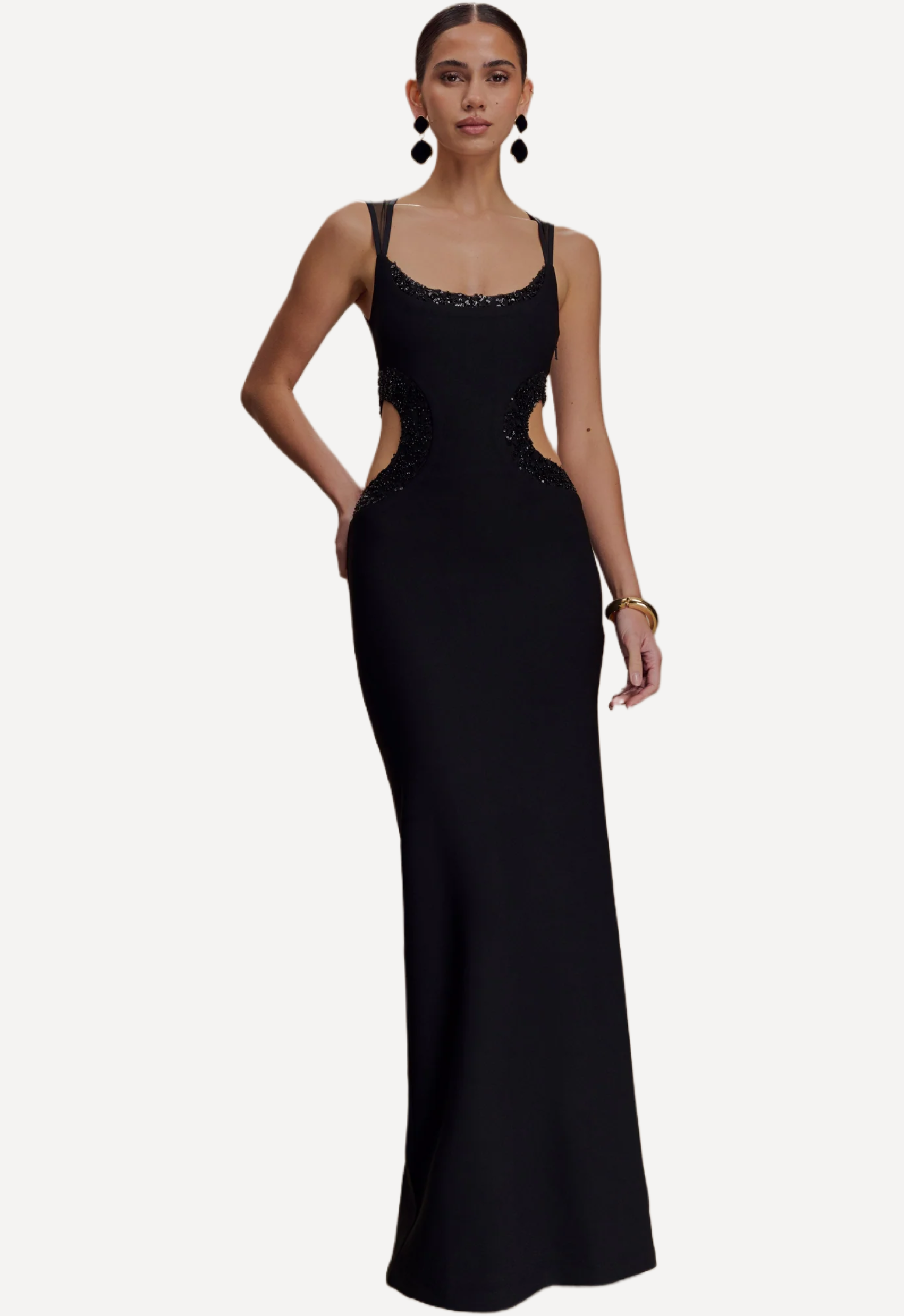 The Angelique Beaded Crepe Maxi Dress cut in a sculpting bodycon silhouette features a scoop neckline, waist cut outs and a sheer mesh back design.