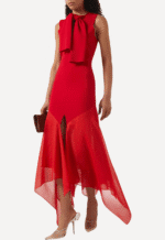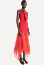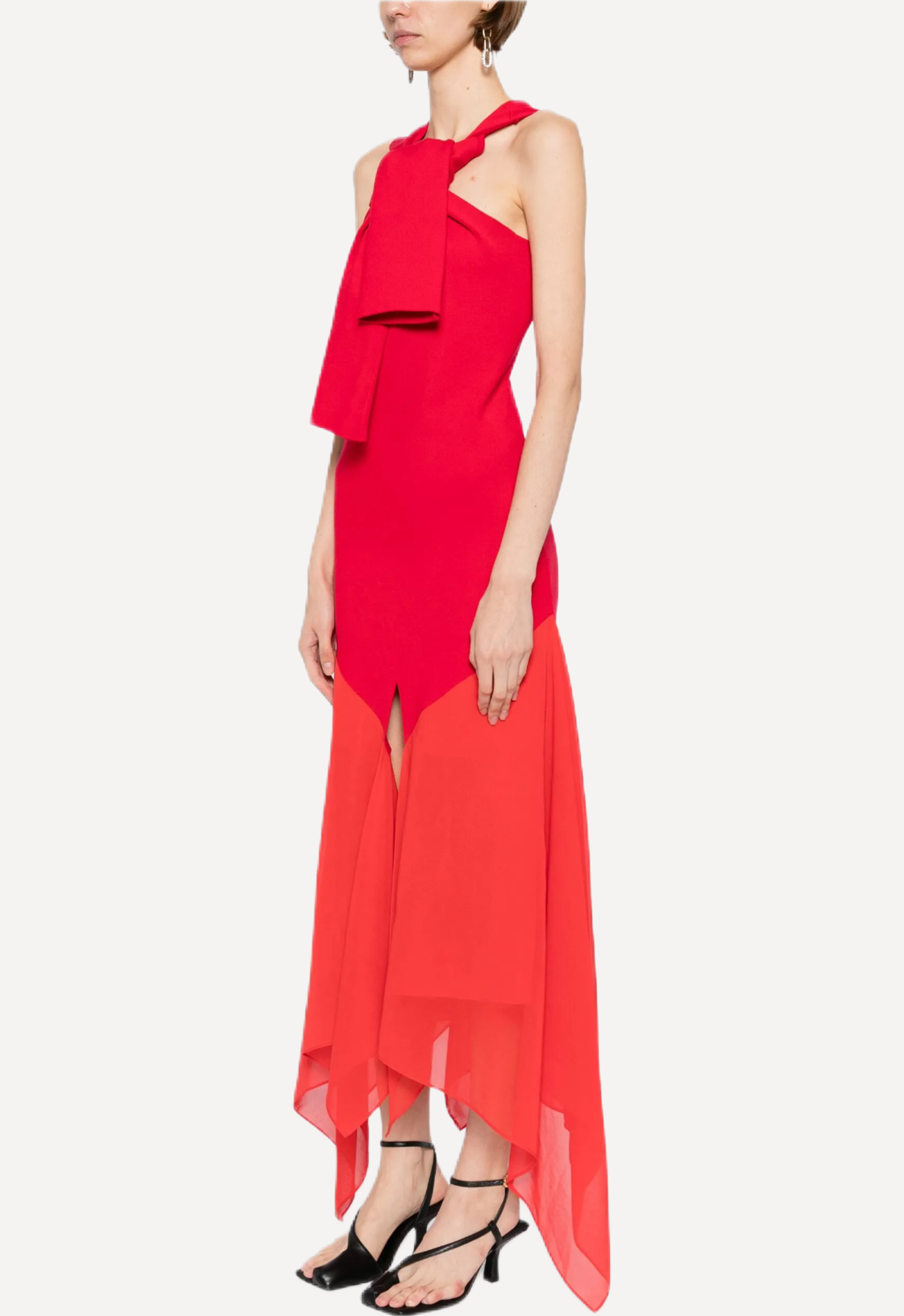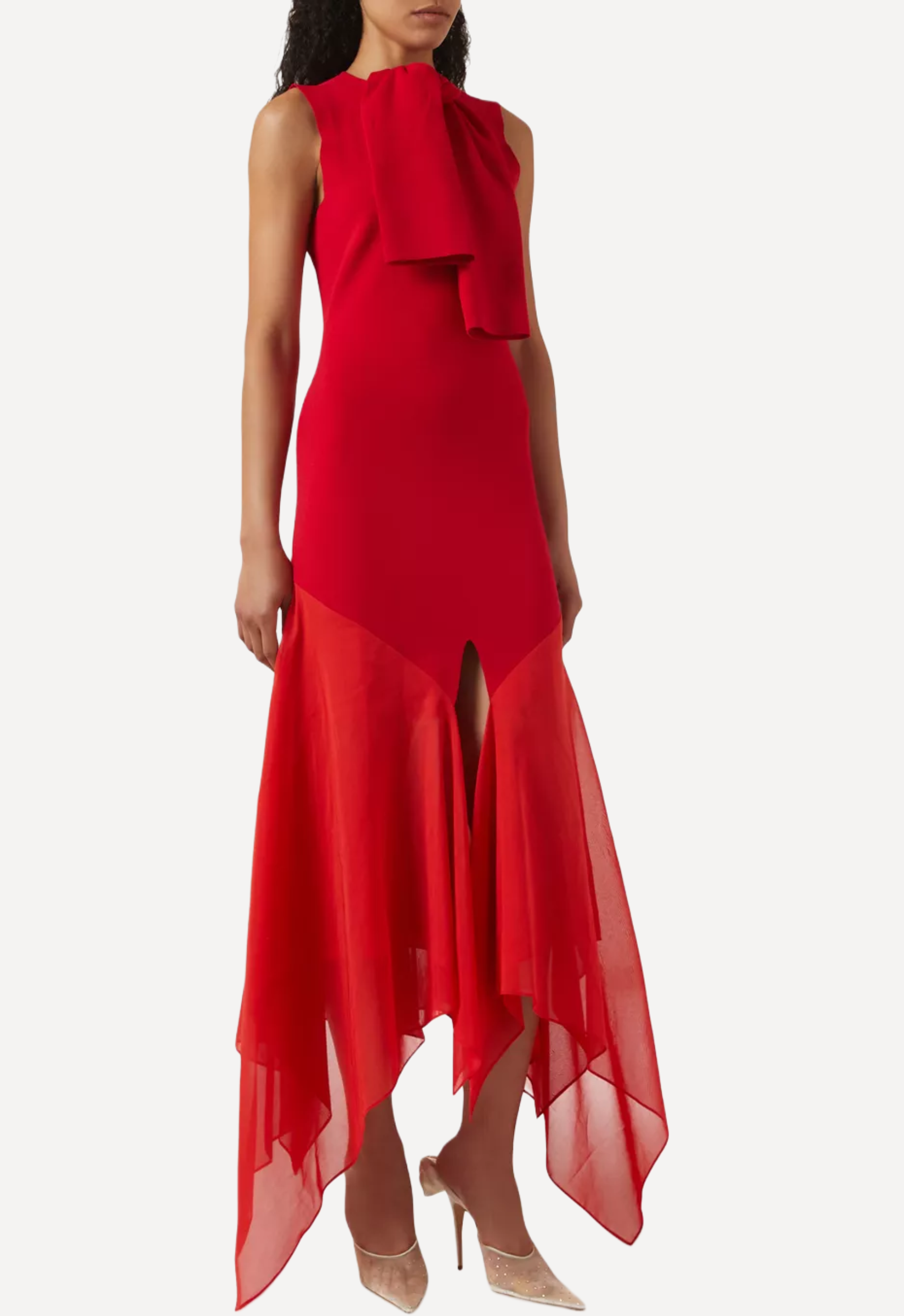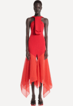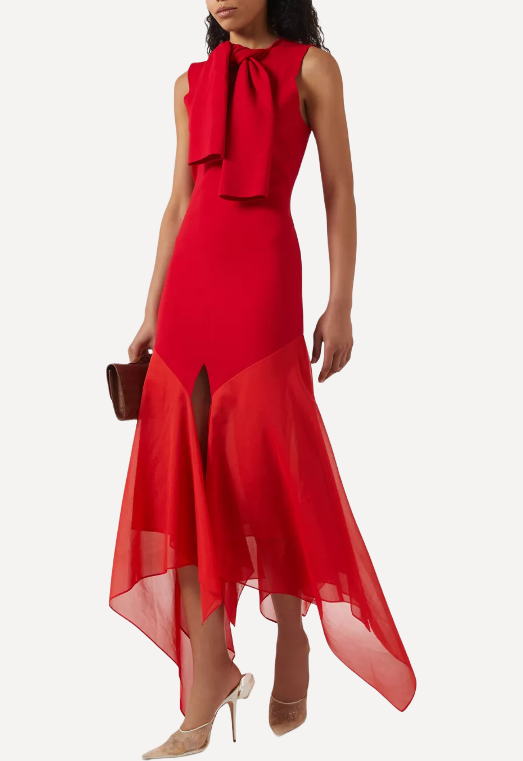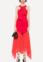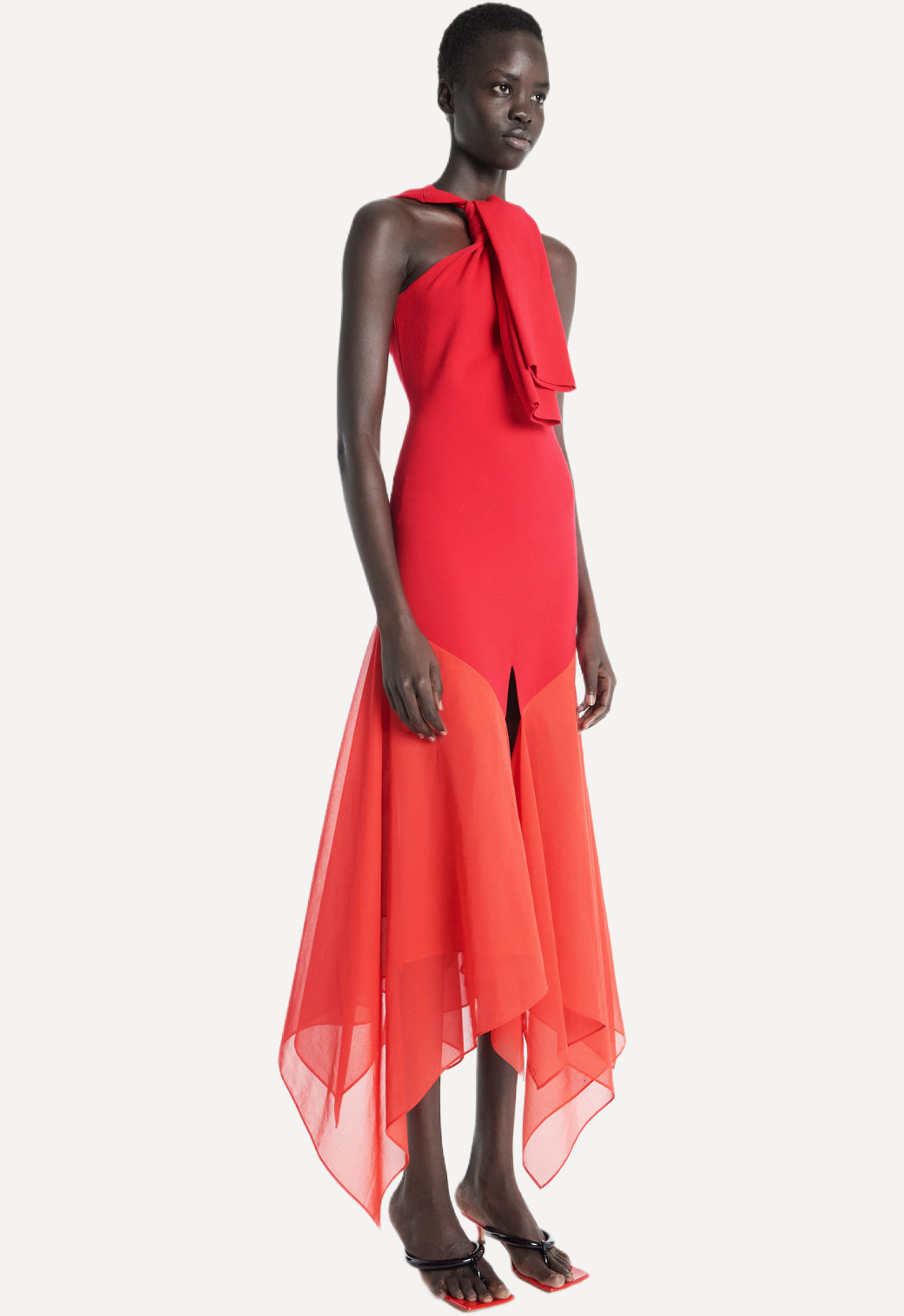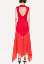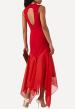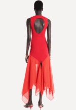 This Awake Mode Asymmetric Knit Dress features a fitted knit bodice balanced by a flowing, asymmetric organza hem, while a bold back cut-out adds a modern edge. The interplay of textures and transparency adds dimension, while the midi-length silhouette makes for a bold, refined impression.