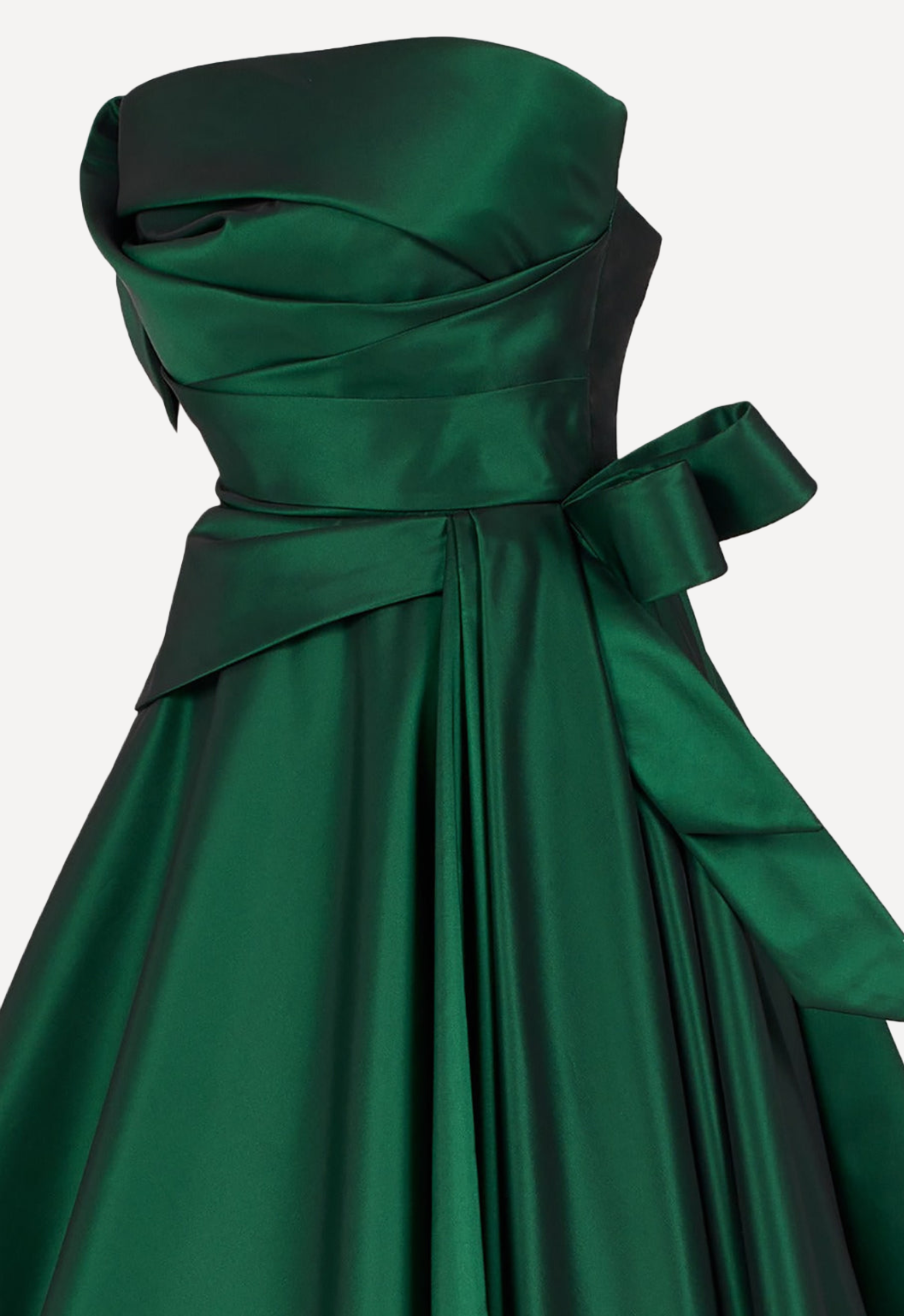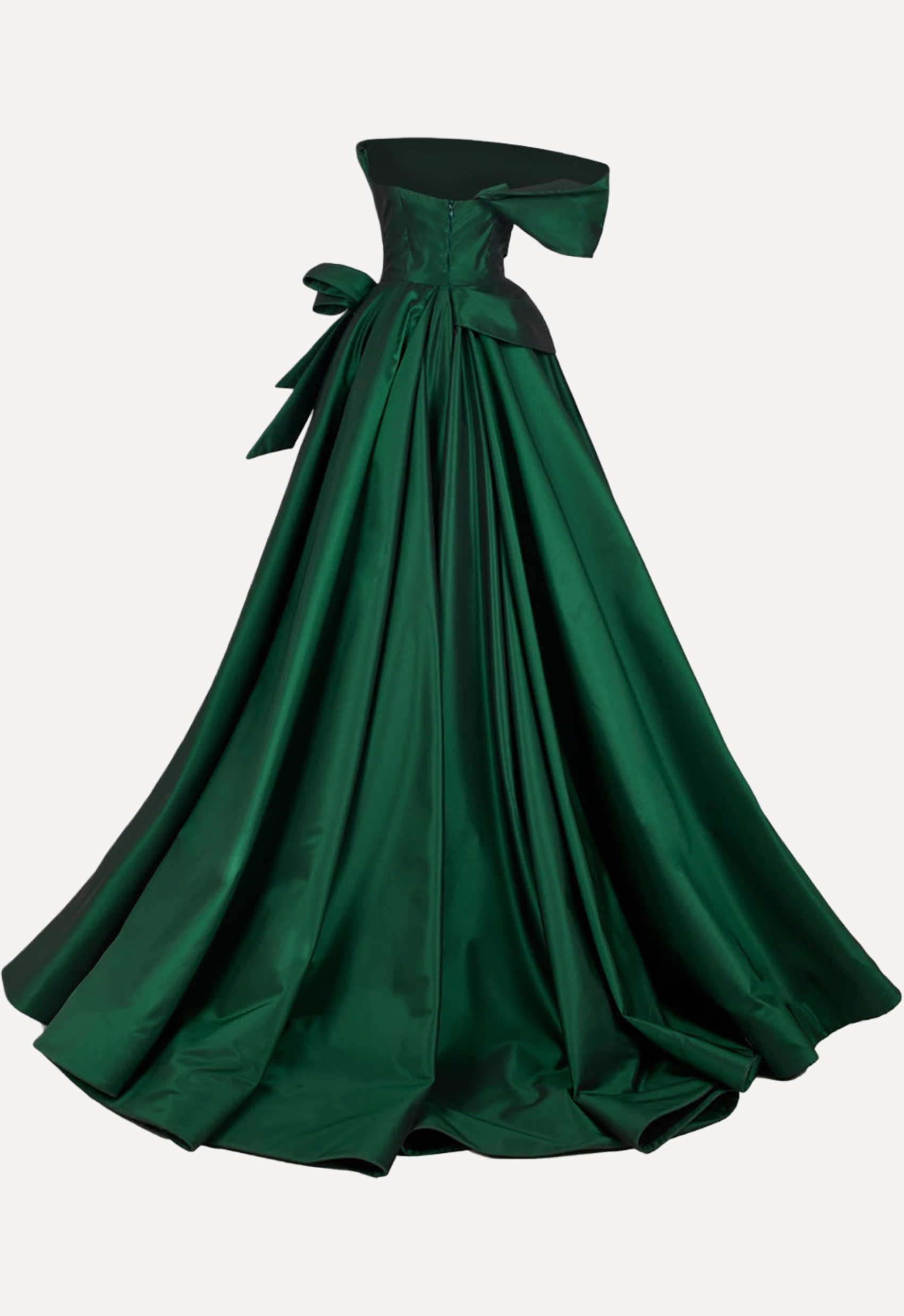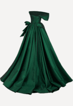 The off-the-shoulder bodice is artfully draped, wrapping gracefully across the neckline to create a soft, folded effect that enhances the décolletage. A structured waist cinches the figure beautifully, highlighted by an asymmetric peplum detail that adds architectural dimension. At the side, a dramatic bow accent introduces a touch of femininity and couture flair. Flowing into a voluminous A-line skirt, the gown cascades effortlessly to the floor, creating fluid movement with every step.