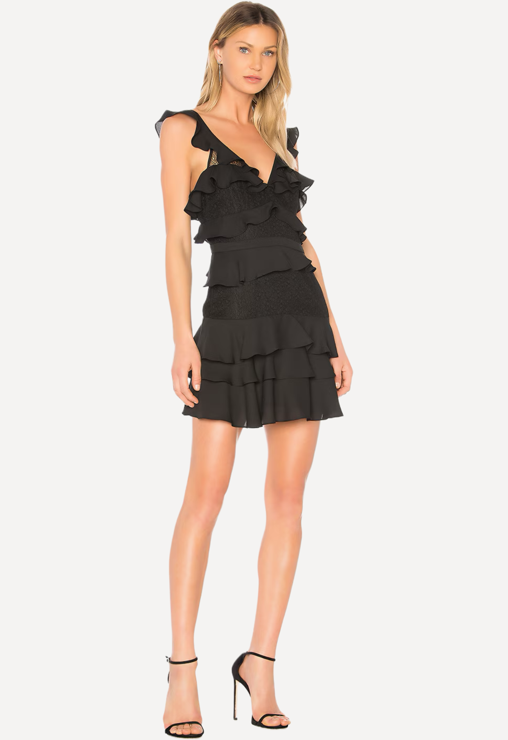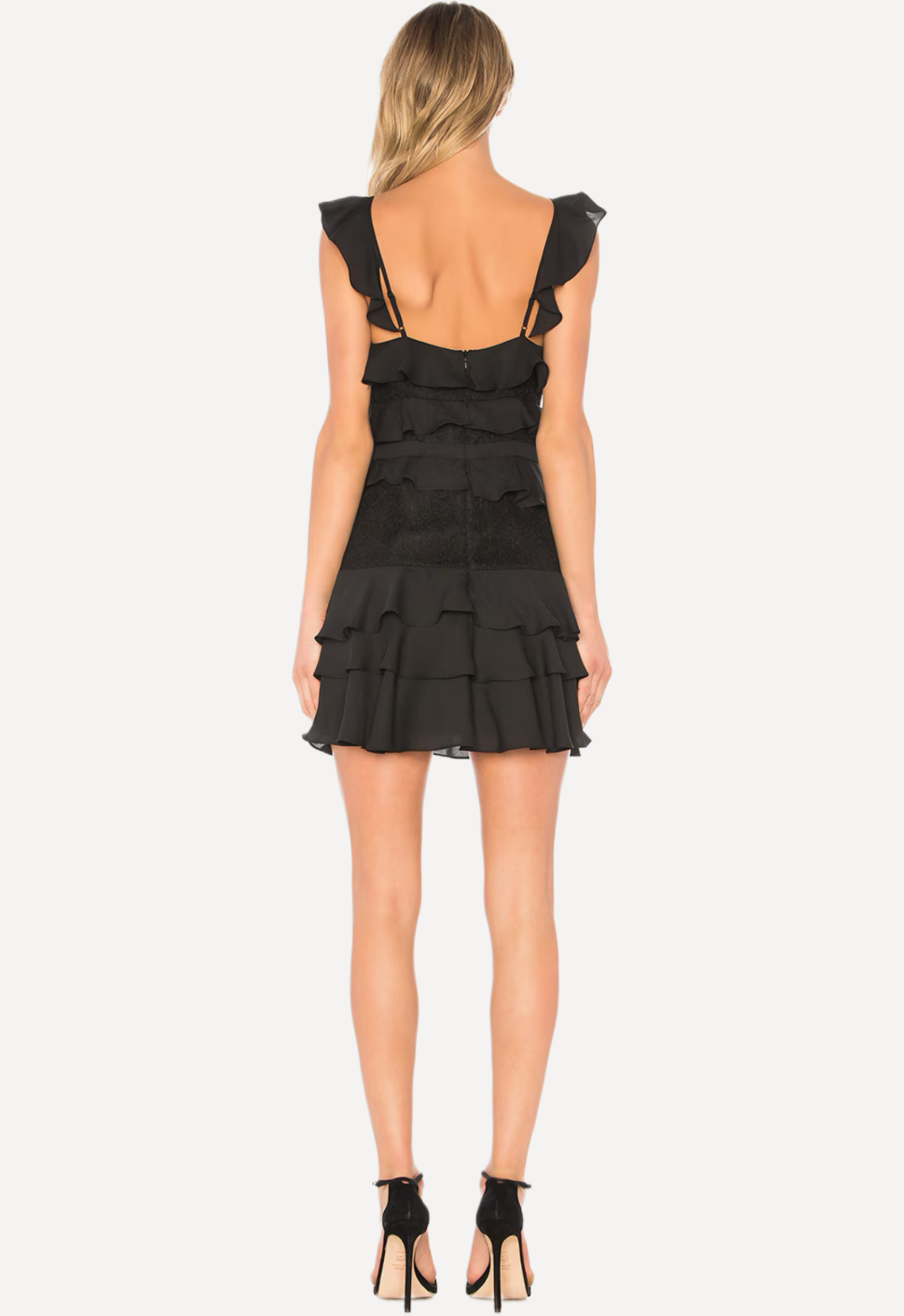 The Babylon Mini Dress by Bardot is a romantic statement piece adorned with delicate lace accents and feminine ruffled detailing throughout.
