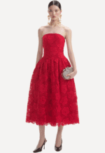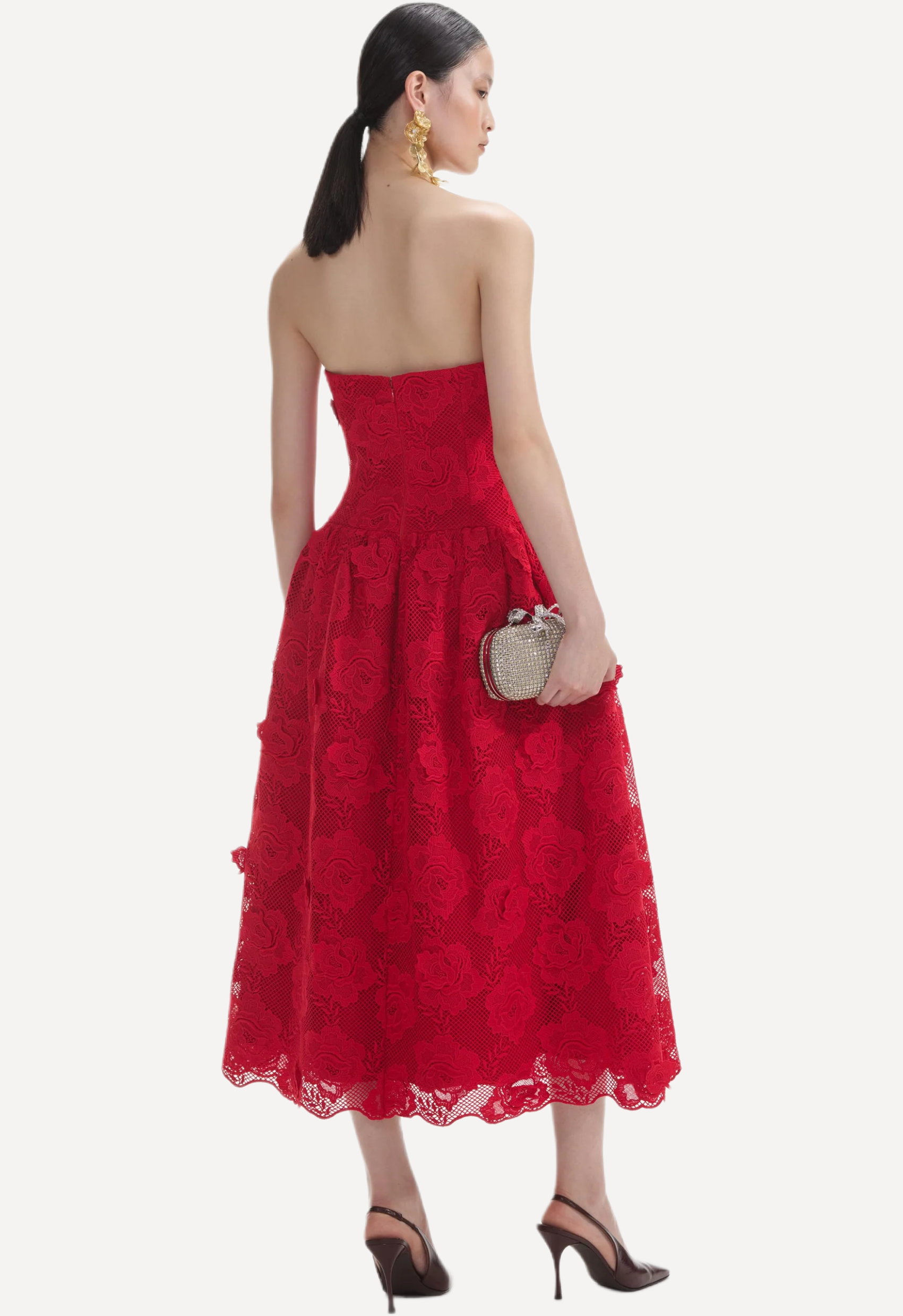 This bold red lace dress features intricate flower detailing that beautifully complements its sculpting bodice and voluminous skirt. Detachable shoulder straps allows for both a classic and strapless look.