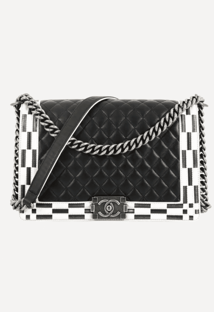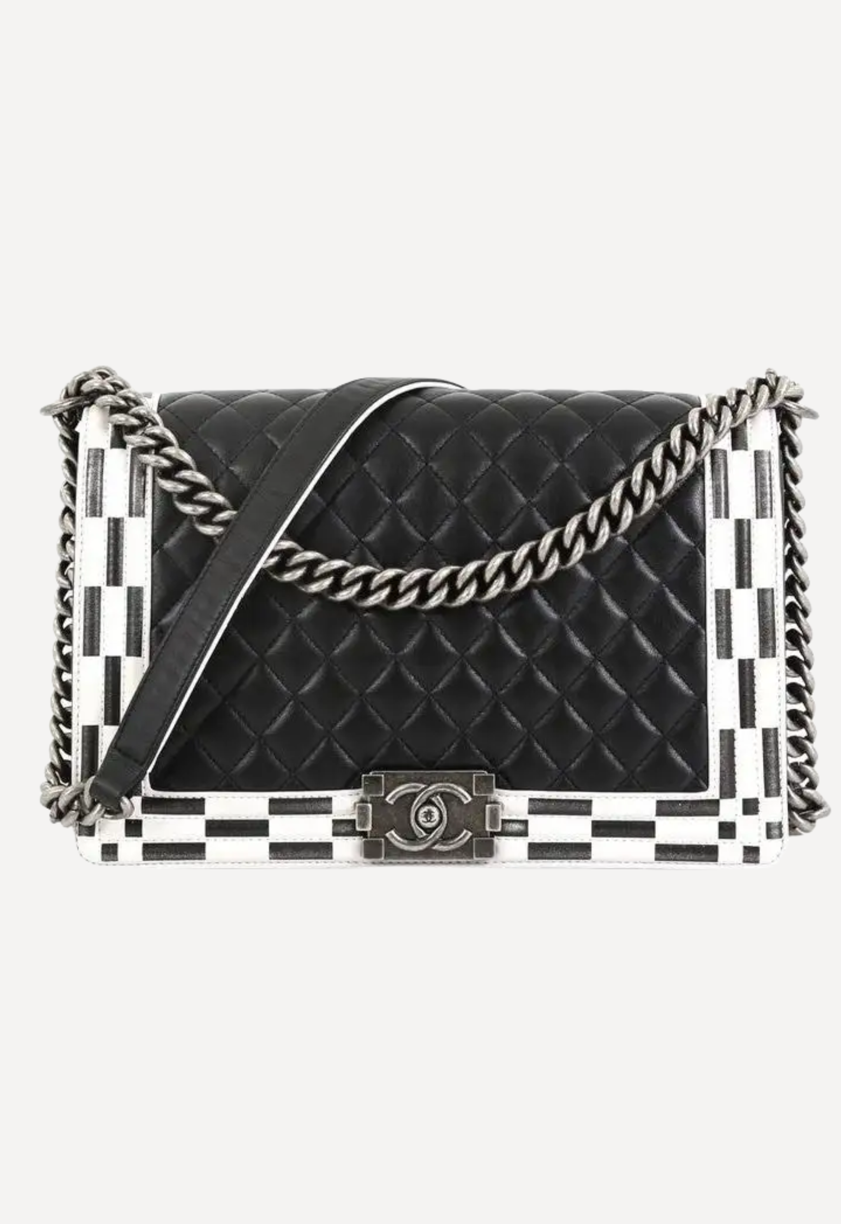 The Chanel Bicolor Flap Bag crafted from black and white quilted lambskin leather features a chain link strap with a black shoulder pad and aged silver-tone hardware. It’s CC Boy push-lock closure opens to a single compartment black fabric interior with a side zip pocket.