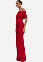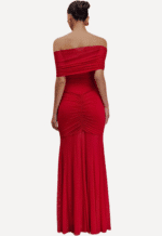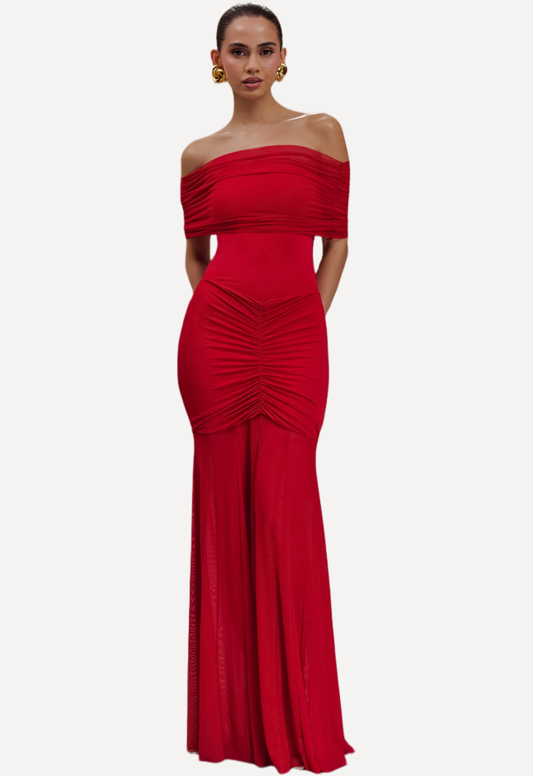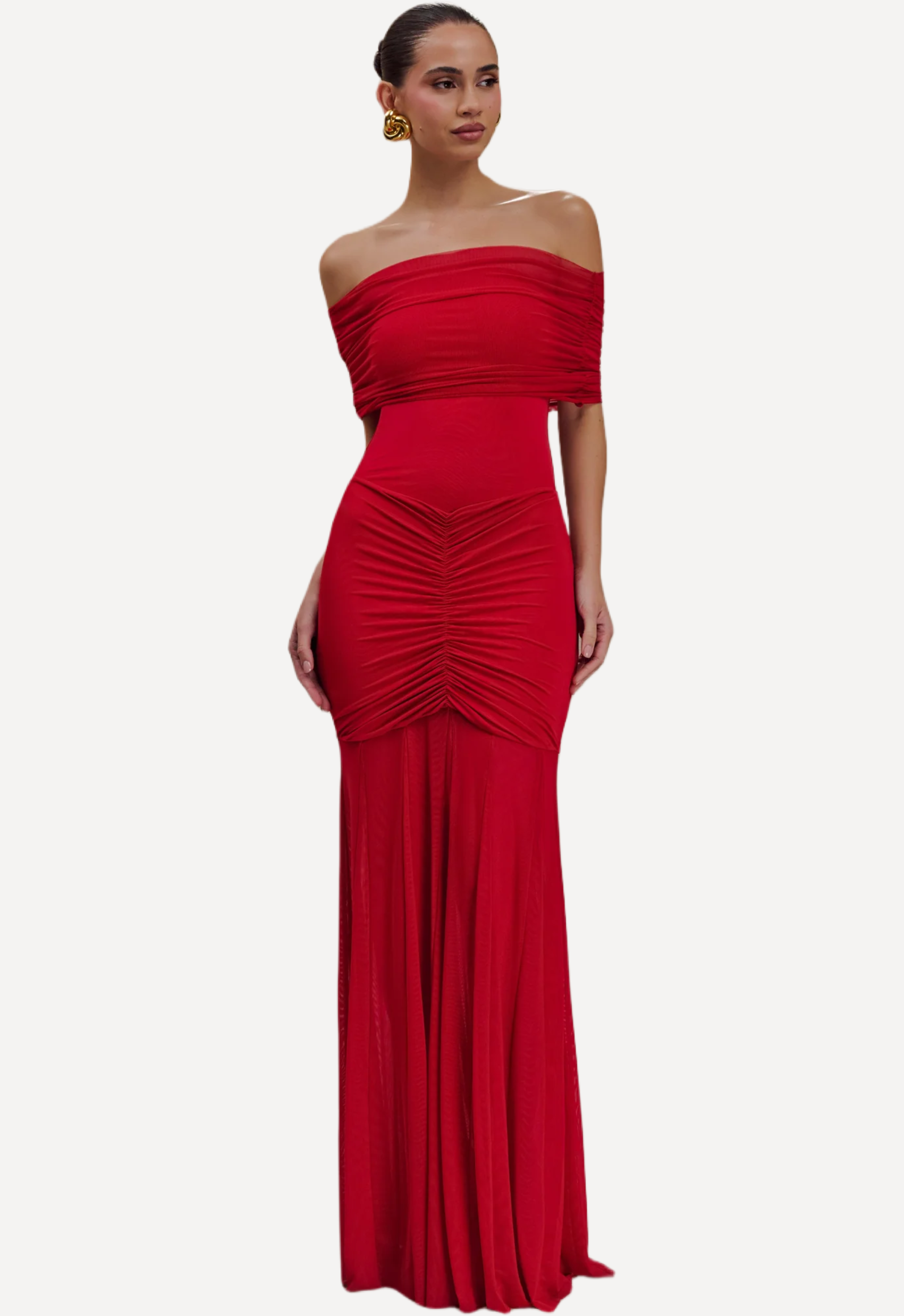 The Caspian Slinky Maxi Dress features a boat neckline and strapless internal design with an elegant mesh overlay. The highlight is the ruching detail and flowing mesh skirt.