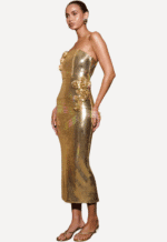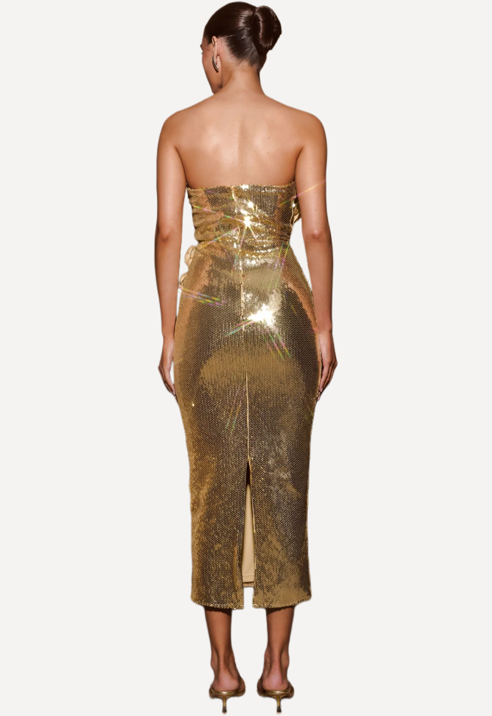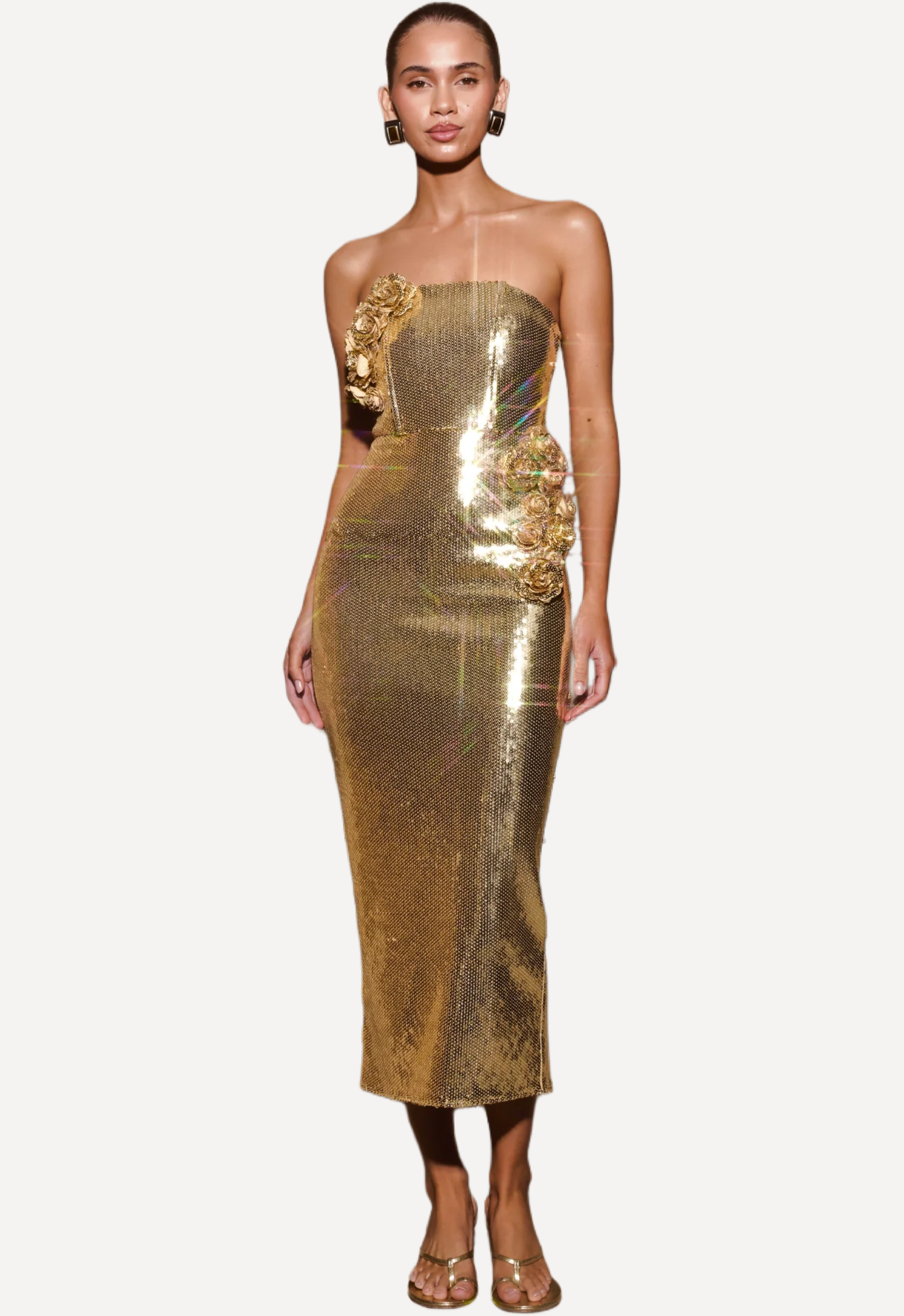 The Cassia Strapless Sequin Rose Midi Dress embellished with delicate sequin flower details is crafted in a fitted skirt silhouette to accentuate the body.
