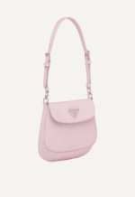 A perfect synthesis of classicism and futurism, the Prada Cleo bag features curved and essential lines, highlighted by the inclined construction on the bottom and sides. It also features a flap closure with a magnet, metal finishes, logo on enameled metal triangle on the flap, nylon interior with logo card slot and a handle with leather extension for cross-use.