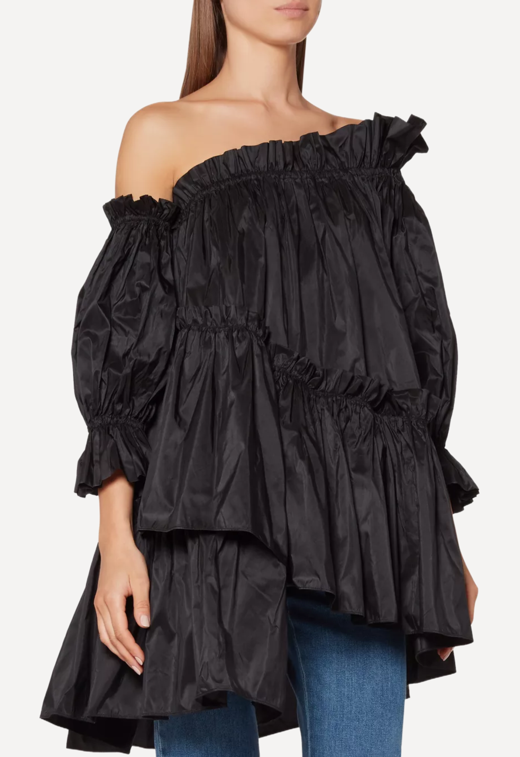 The decadence dress features a striking one-shoulder asymmetrical neckline, three-quarter flounce sleeves, and ruffled panels at the neckline and waist.
