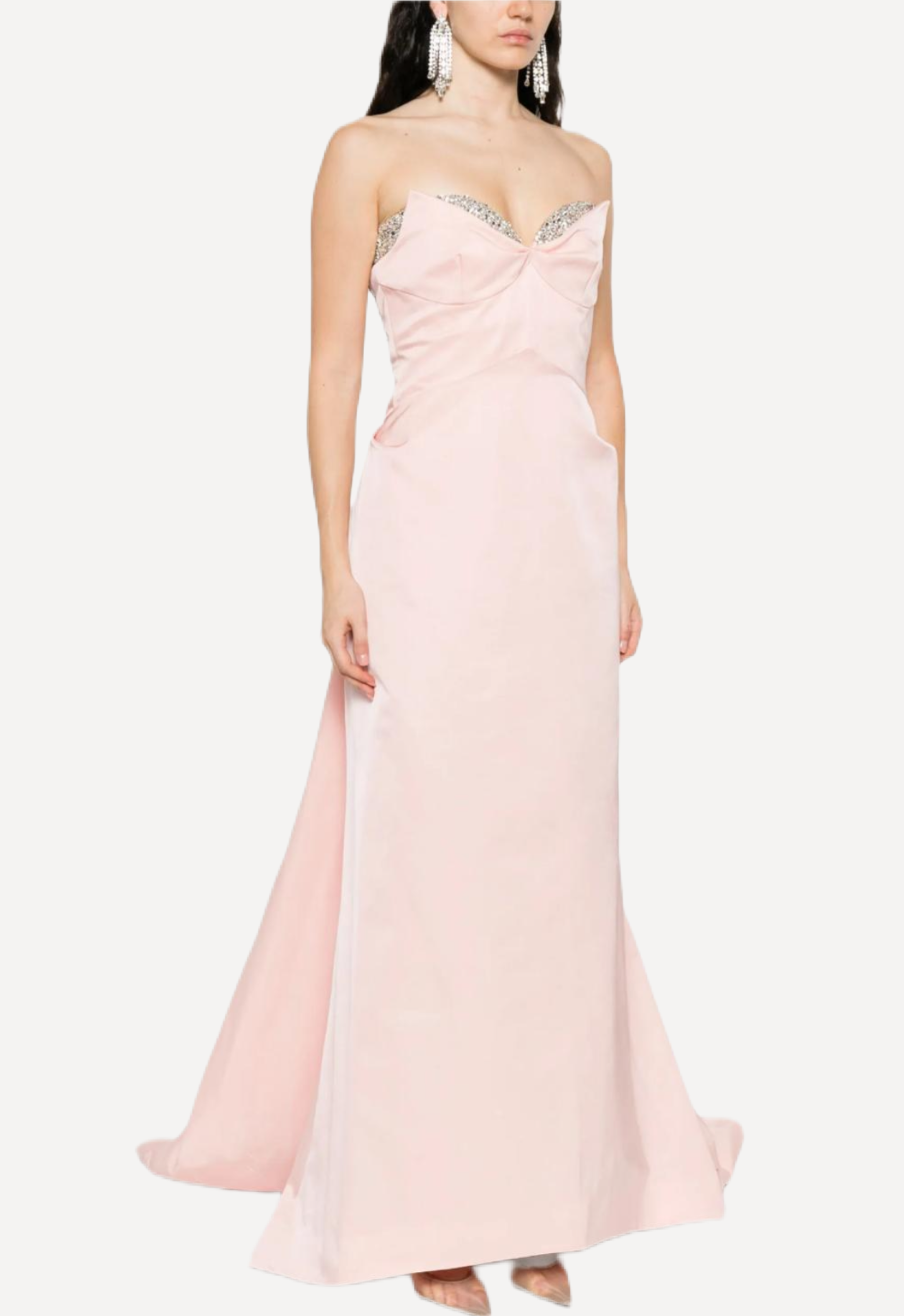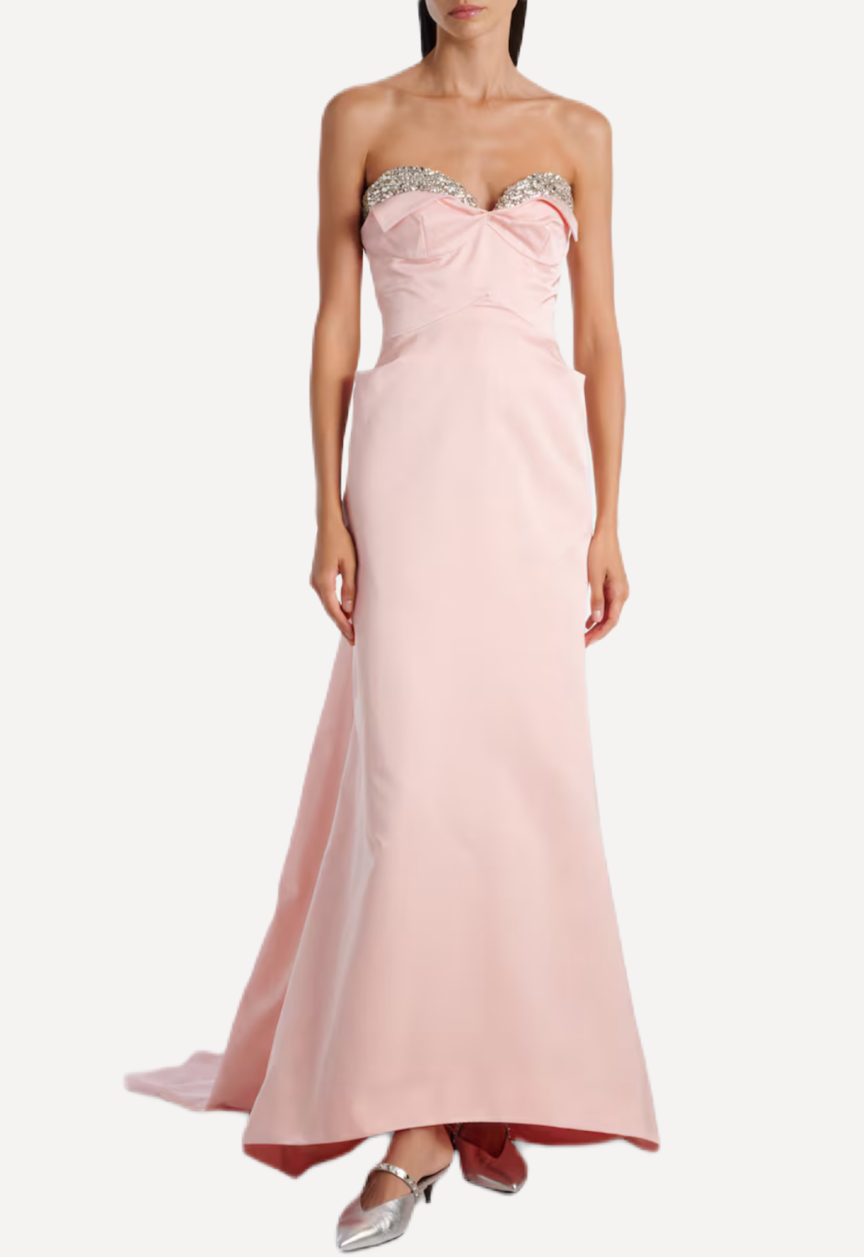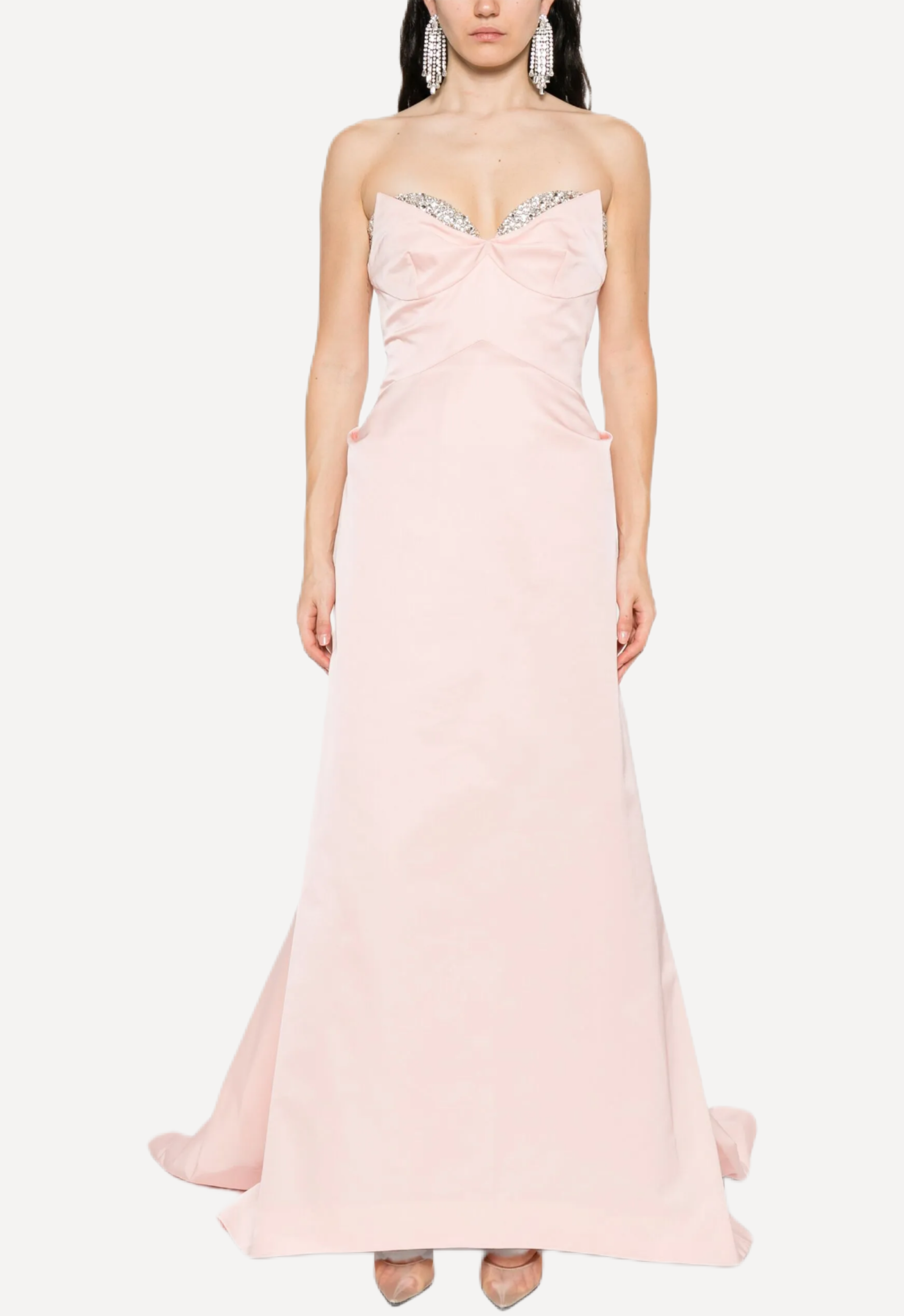 This Alexander McQueen Duchess Satin Gown in blush pink embodies refined glamour with its sculpted, strapless silhouette and impeccable craftsmanship. The bodice features a softly draped sweetheart design embellished with shimmering crystal detailing, adding a touch of opulence to the clean, structured lines of the satin gown. Falling into a fluid, floor-skimming skirt with a subtle flare, the piece balances romantic softness with McQueen’s signature architectural elegance.