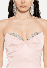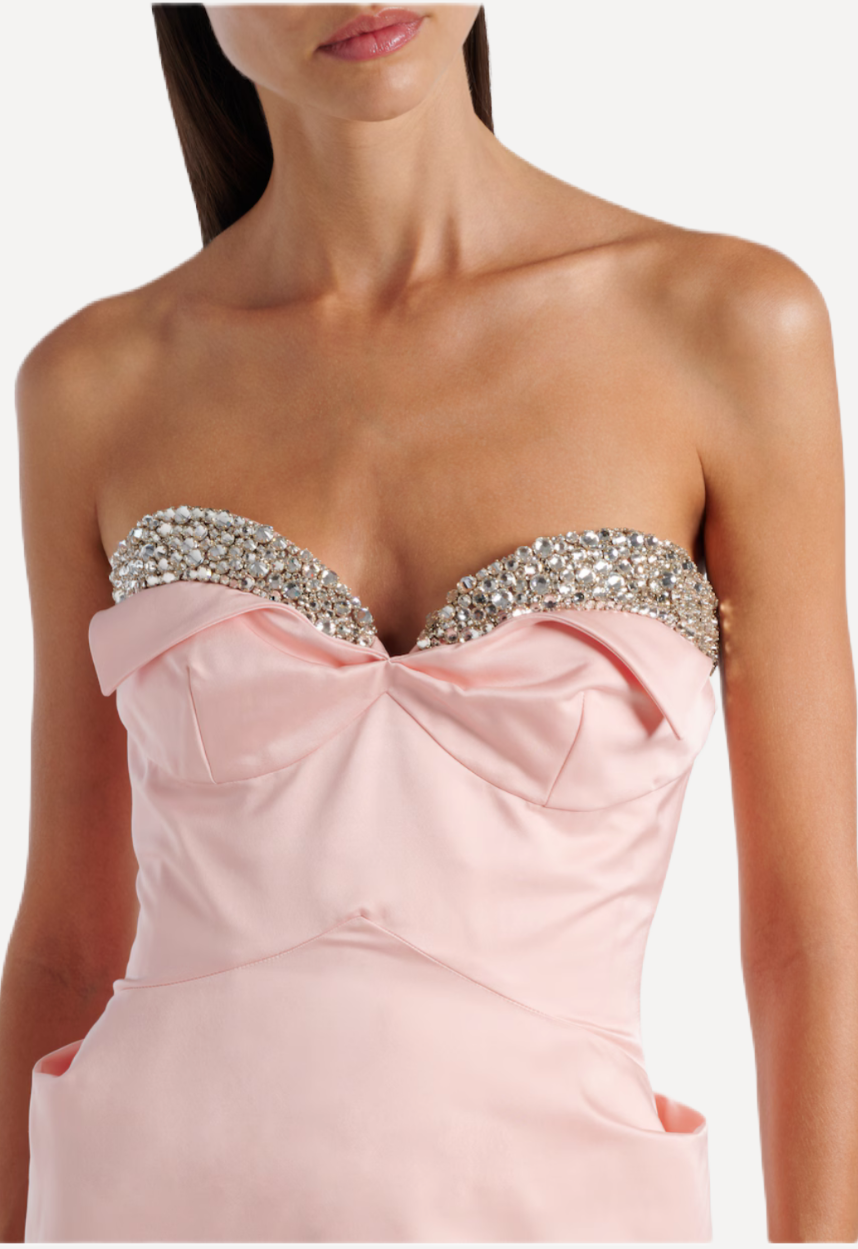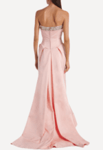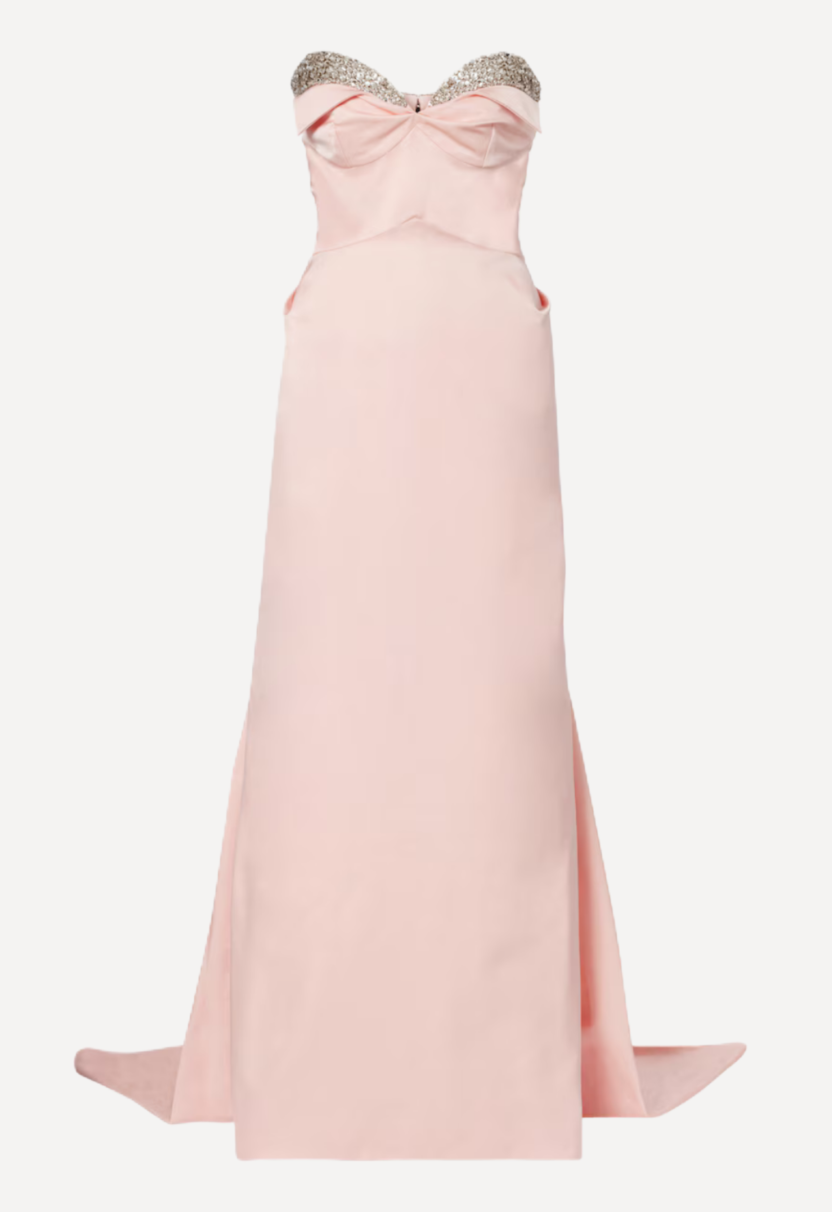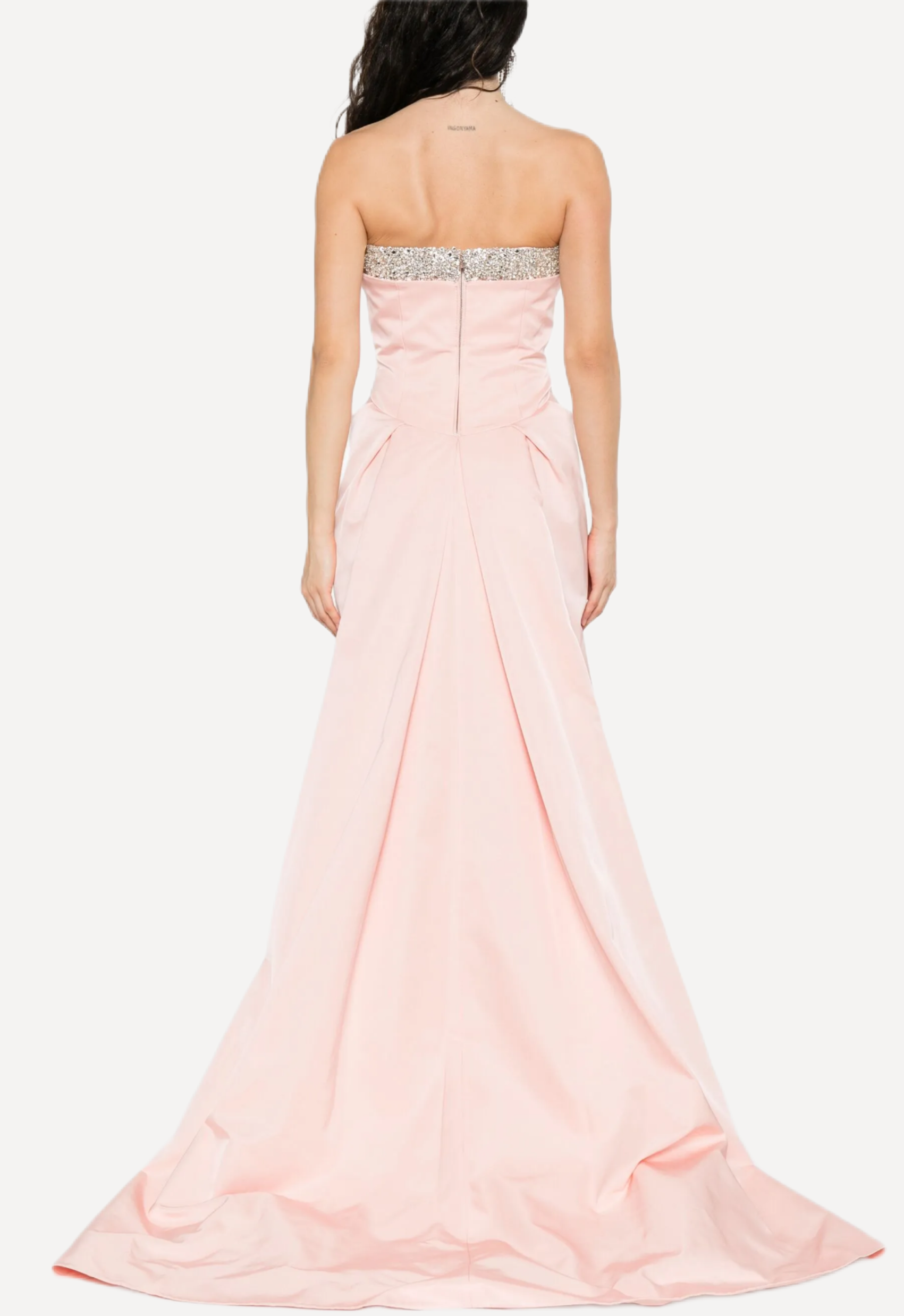 This Alexander McQueen Duchess Satin Gown in blush pink embodies refined glamour with its sculpted, strapless silhouette and impeccable craftsmanship. The bodice features a softly draped sweetheart design embellished with shimmering crystal detailing, adding a touch of opulence to the clean, structured lines of the satin gown. Falling into a fluid, floor-skimming skirt with a subtle flare, the piece balances romantic softness with McQueen’s signature architectural elegance.