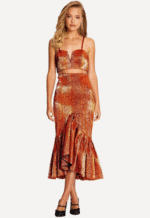 The Electric Nights set features a mermaid style fitted midi skirt, and a matching top painted in subtle metallic stripes.