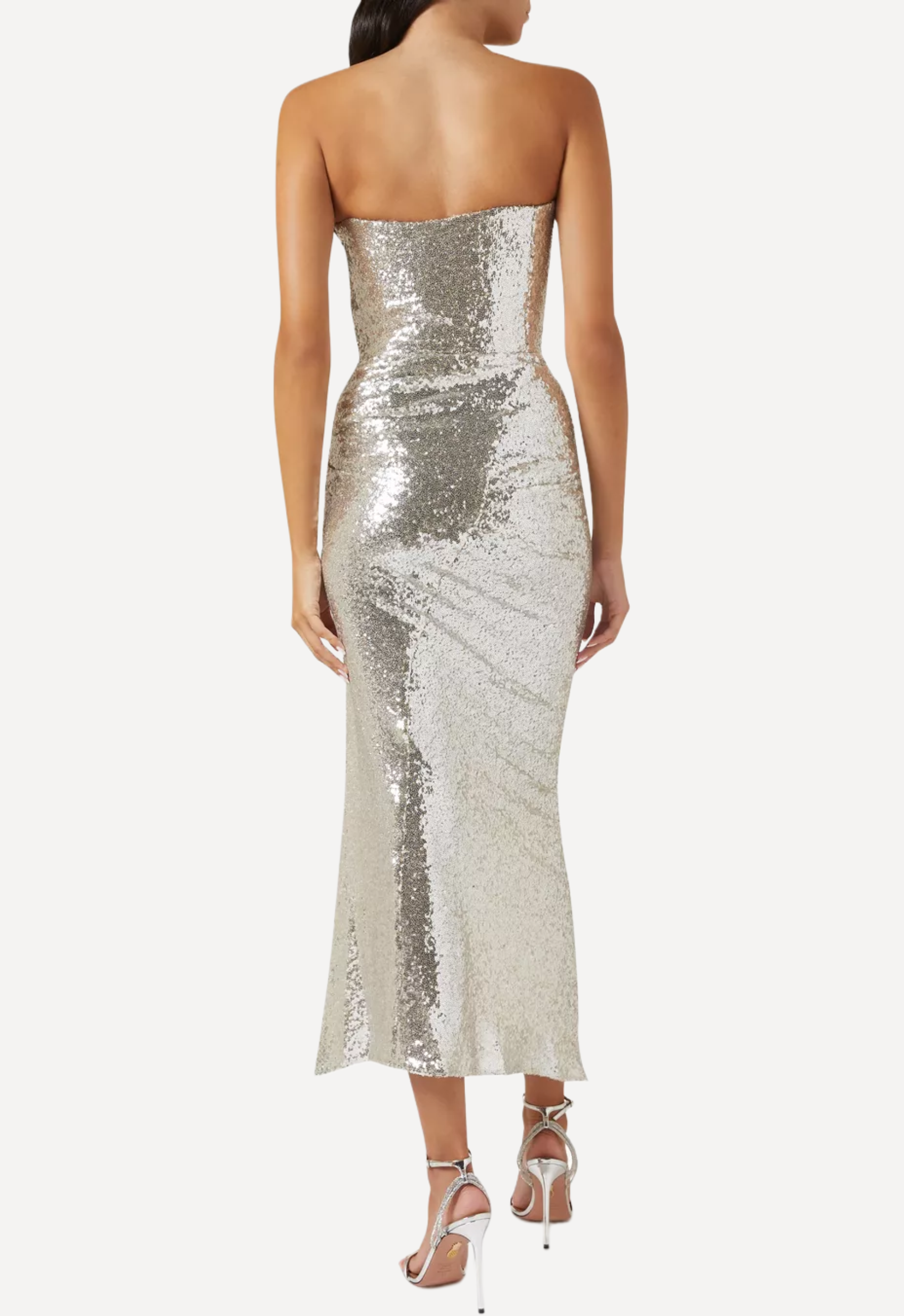 The Exhilirate Gown by Maticevski features a sculptural silhouette with a strapless construction and angular rounded neckline that skims across the collar accentuating the decolletage. The strapless neckline cinched waist, and exposed side zip arrive at an asymmetrically draped hem that hits the ankle. It is drenched in tiny shimmering sequins and impeccably tailored for a fierce, form-fitting silhouette.
