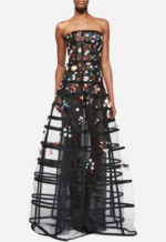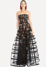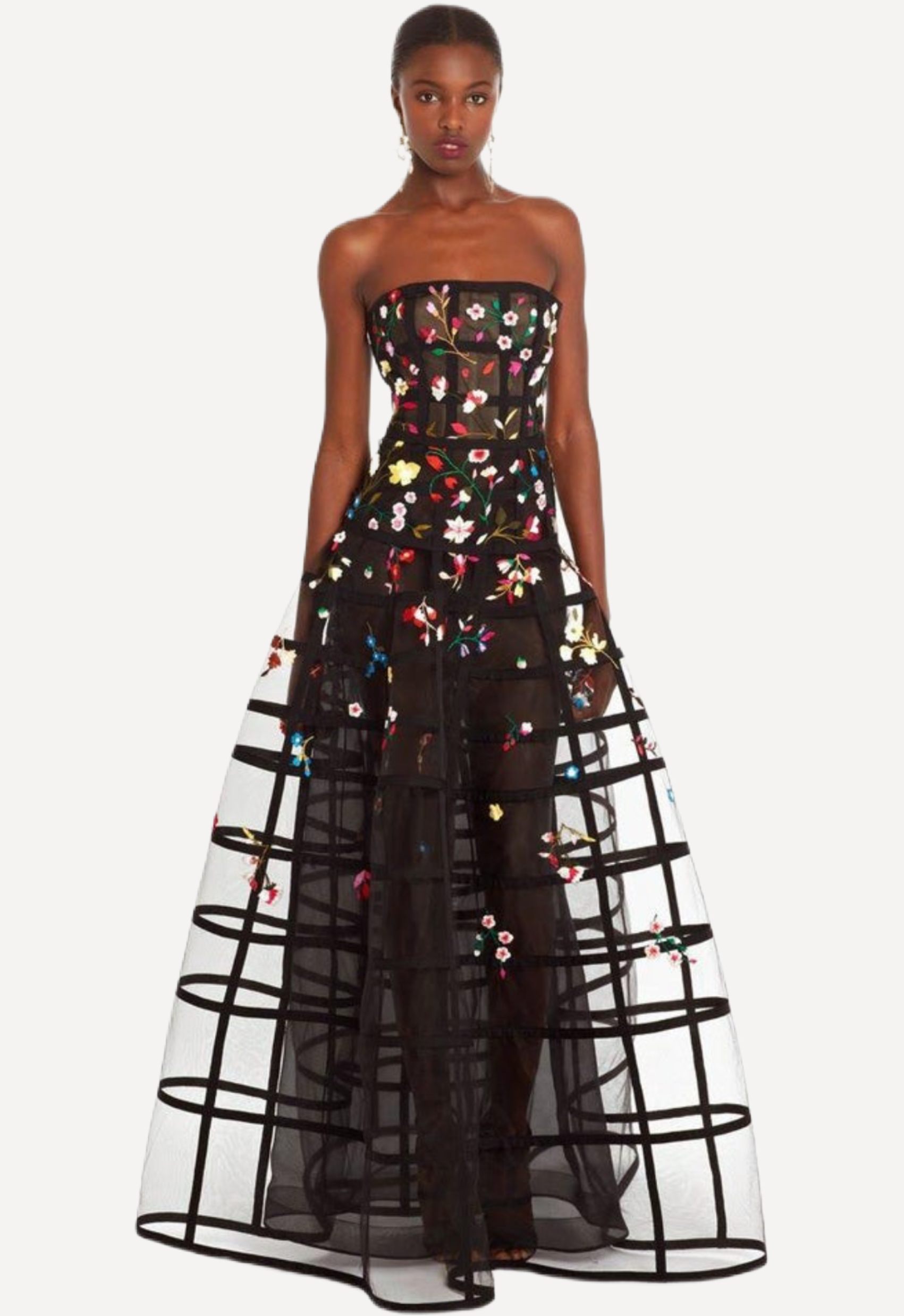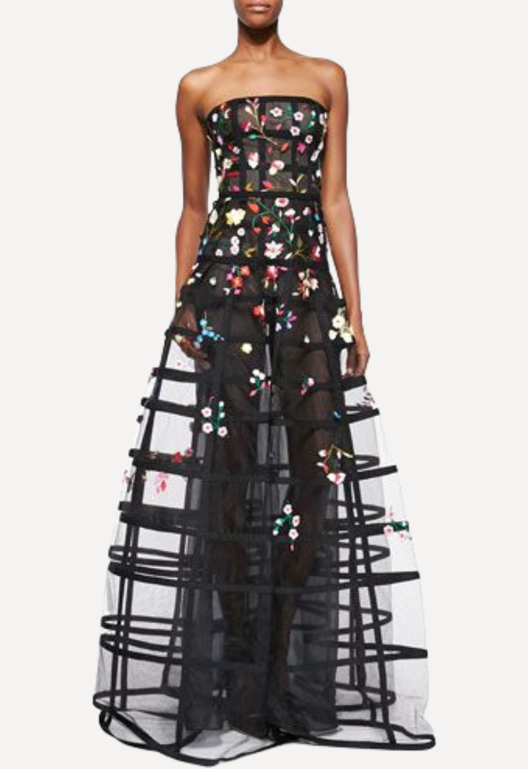 A statement piece that embodies modern artistry and timeless elegance, this strapless gown features a structured cage skirt crafted from sheer black tulle panels. The fitted corset bodice is adorned with vibrant, multicolored floral embroidery that cascades down through the architectural frame, creating a striking contrast between delicate blooms and bold lines. Designed to enchant from every angle, the gown balances romance with edge—making it the perfect choice for a red-carpet entrance or an unforgettable evening occasion.
