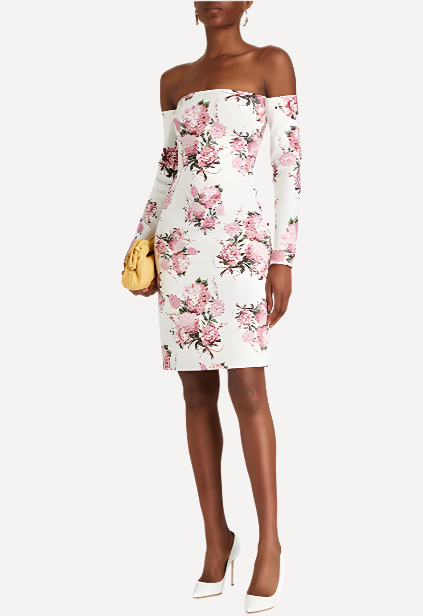 This Emilia Wickstead midi dress has a strapless off-the-shoulder neckline, delicately framing the décolletage. The highlight is the intricate floral print that adds a timeless charm.