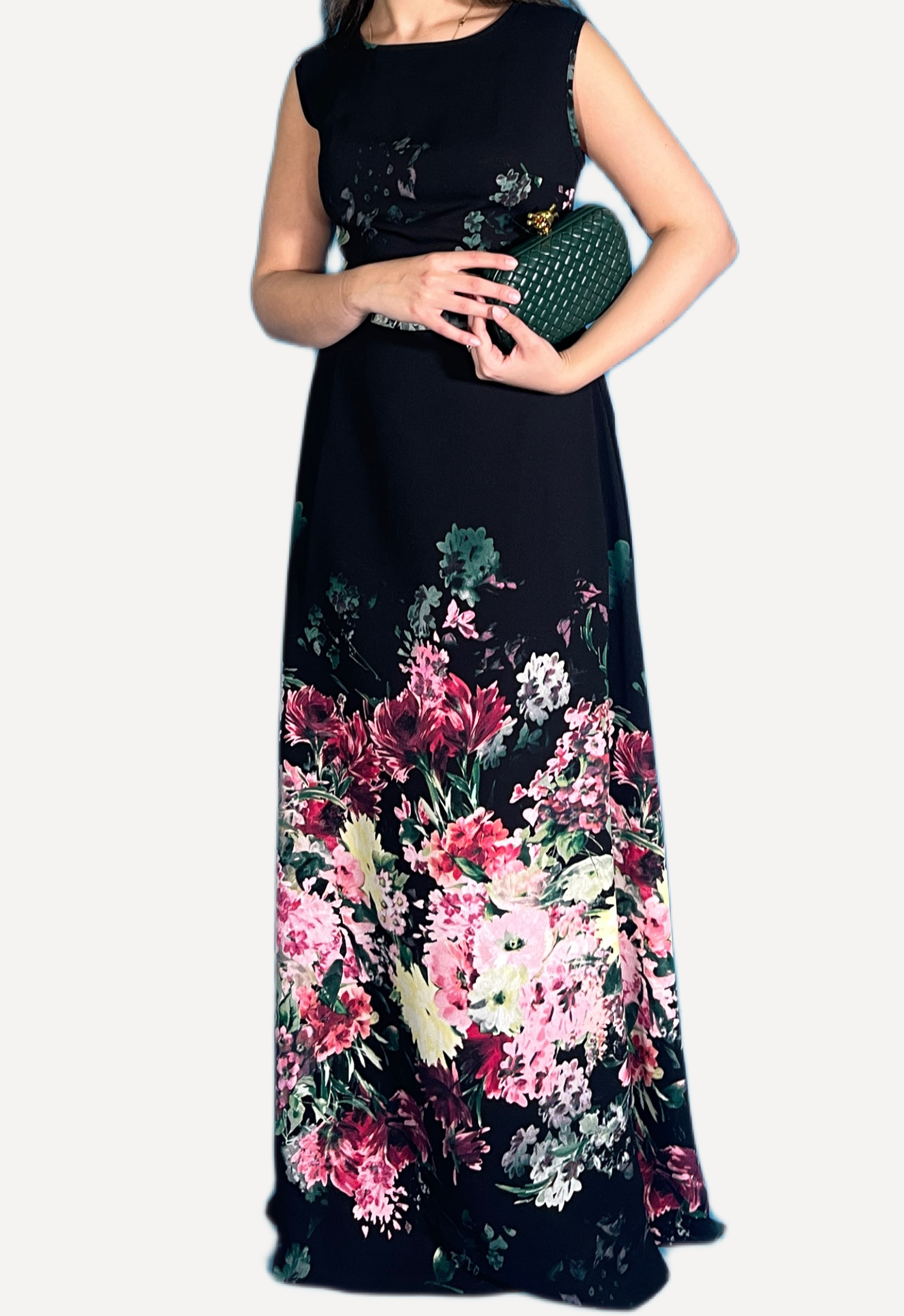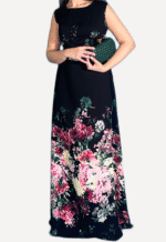 This dress is gracefully tailored to flatter the body with a flowing skirt that cascades elegantly to the floor. The highlight is the floral detailing that adorns the trim of the dress and delicately graces the waist area.