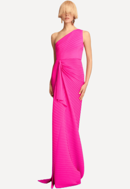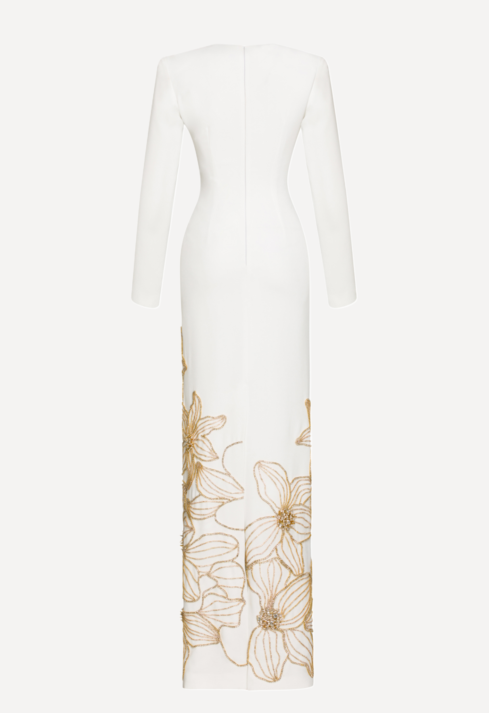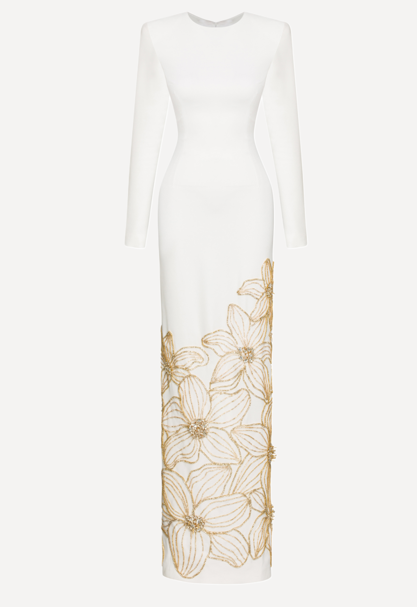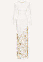 Elegant and understated, this AFFFAIR dress is designed to make a refined statement. Cut in a sleek, body-skimming column silhouette, it features a clean bateau neckline and long fitted sleeves for a timeless, sophisticated look. The minimalist upper body contrasts beautifully with delicate gold floral embroidery cascading across the lower skirt, adding soft texture and subtle shimmer. Crafted in a smooth, structured fabric that enhances the streamlined shape, this floor-length design balances modern simplicity with romantic detailing — perfect for formal events, evening occasions, or elegant celebrations.