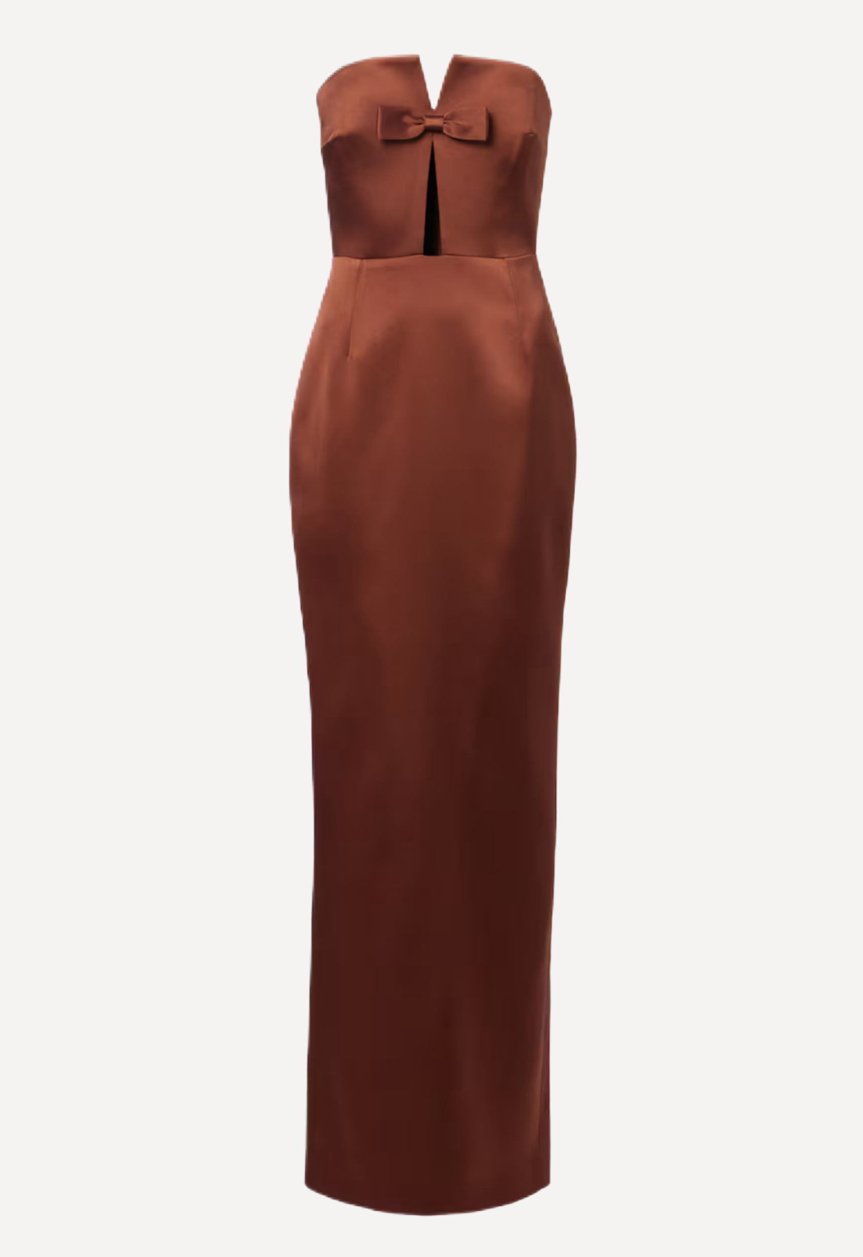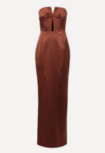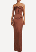 The Holly Dress in Baba Au Ruhm by The New Arrivals is crafted in a rich brown satin that catches the light beautifully. This striking piece features a structured satin corset that sculpts the silhouette, accented by a subtle front cutout for a touch of allure. An elegant bow detail finishes the look, adding a hint of romance to this sophisticated design. Perfect for evenings that call for understated glamour.