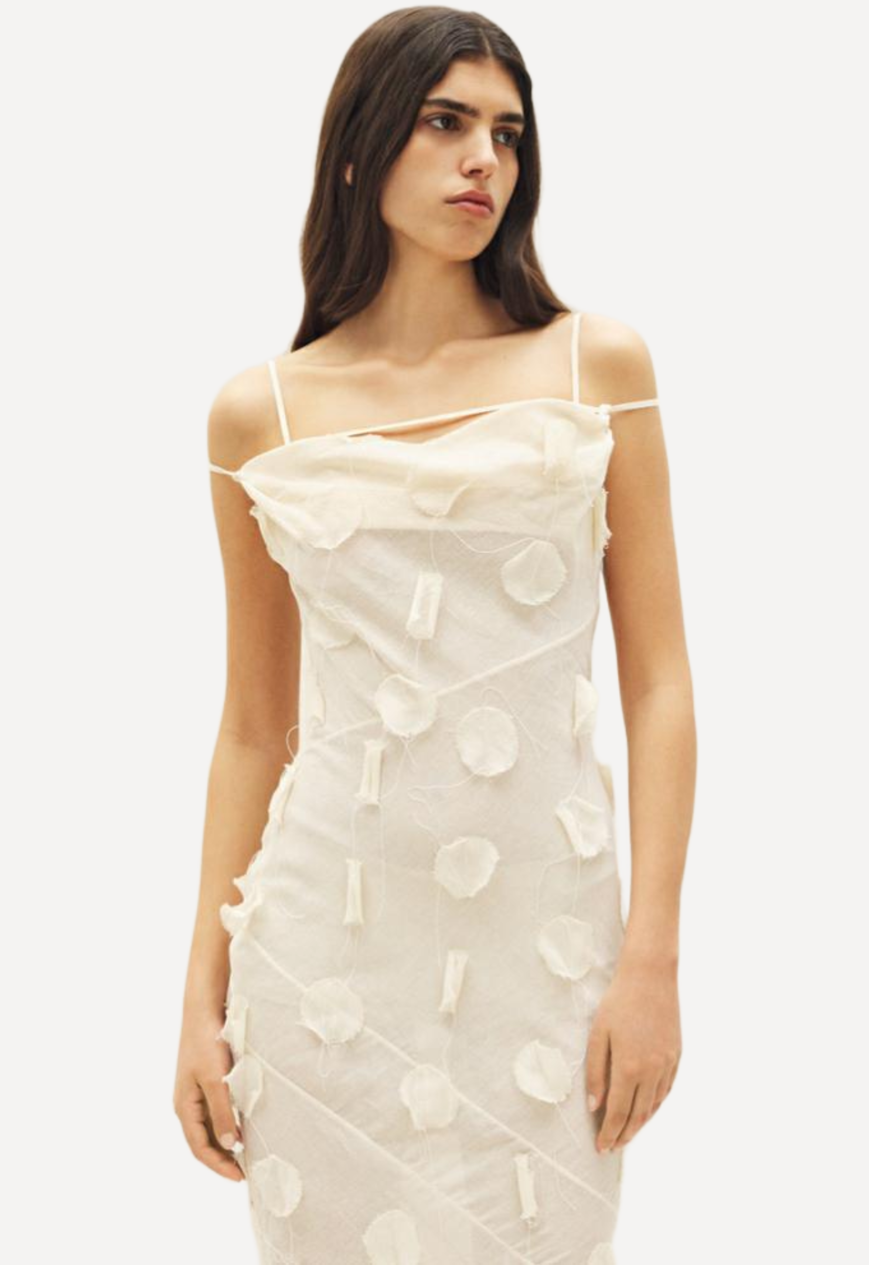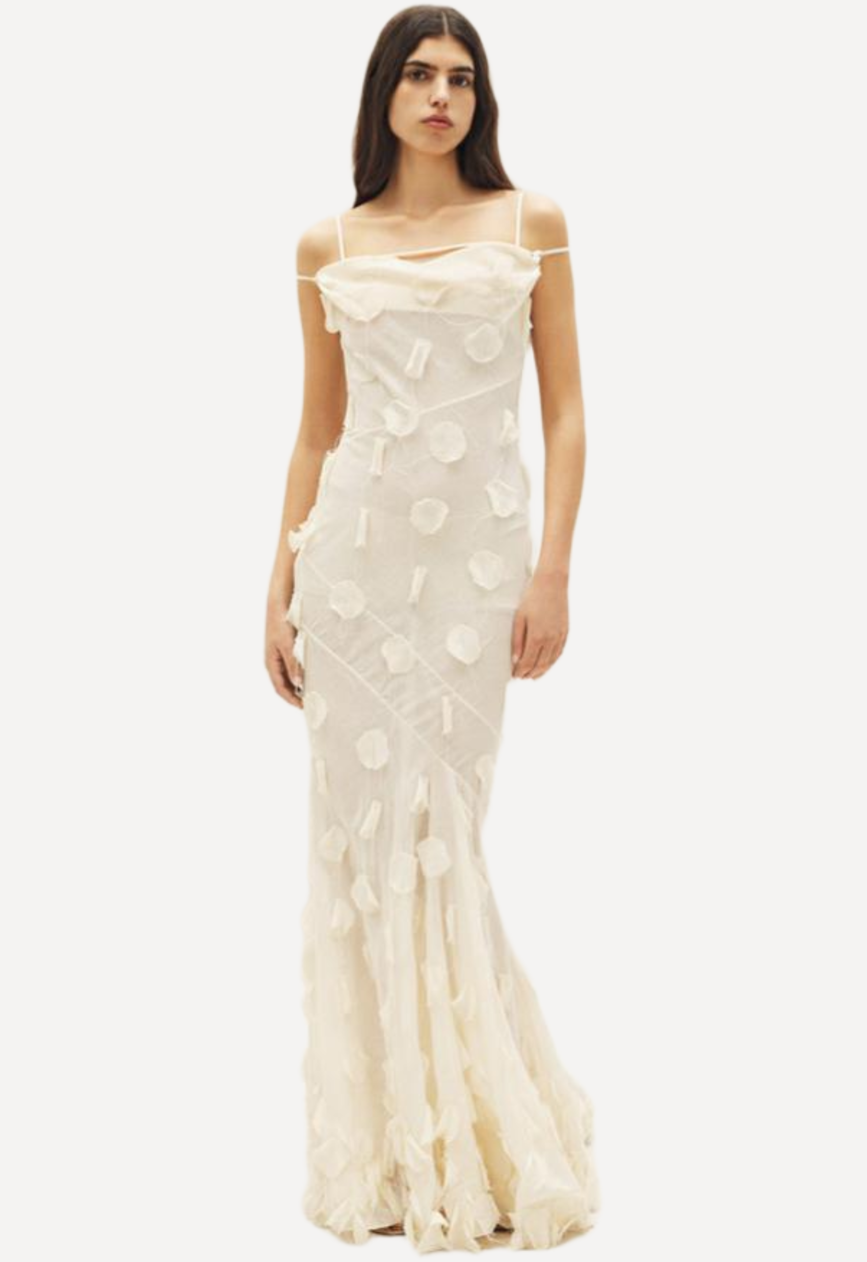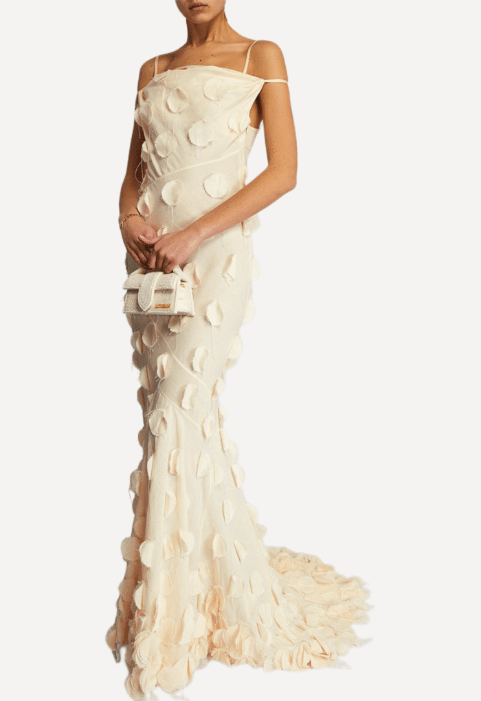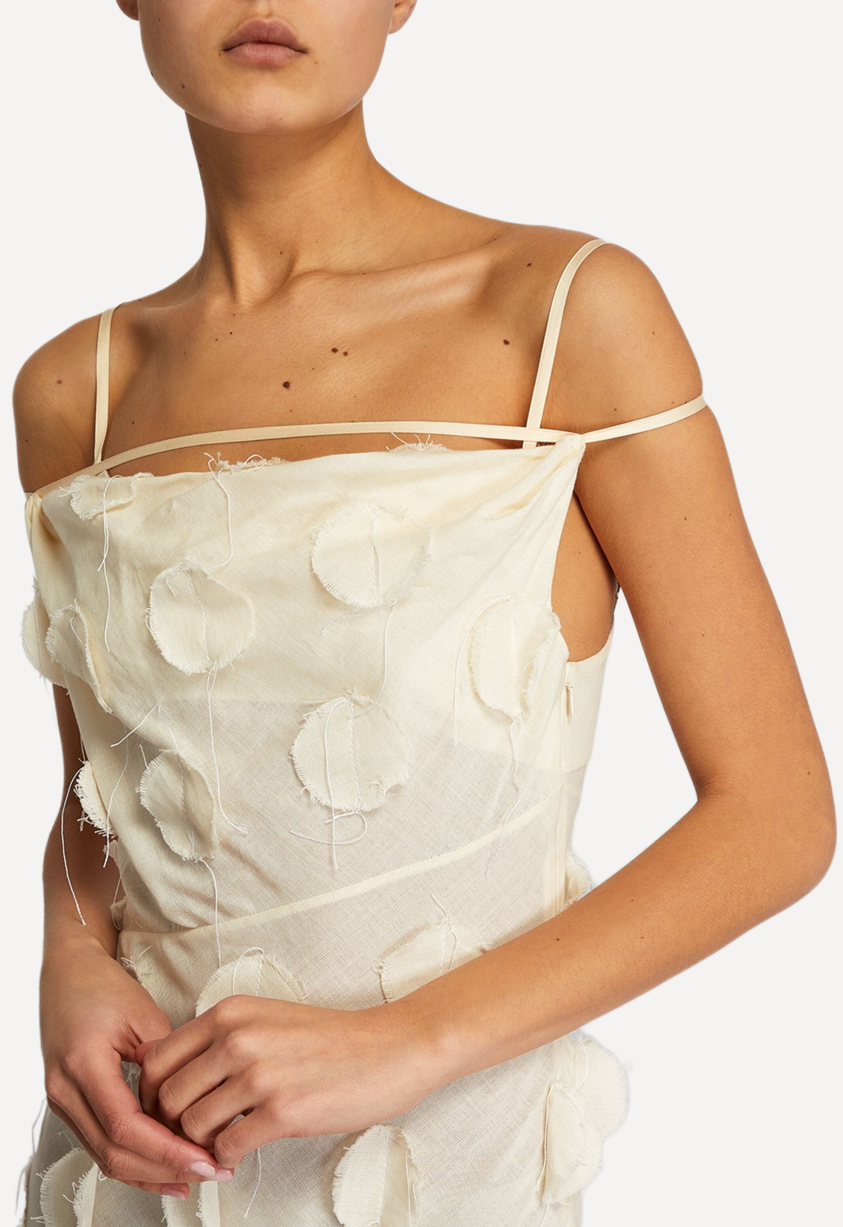 The La Robe Pois Gown is crafted from cotton in a crepe weave, featuring a straight neckline, side zip fastening, shoulder straps, all-over disc appliqués and a fishtail hem.