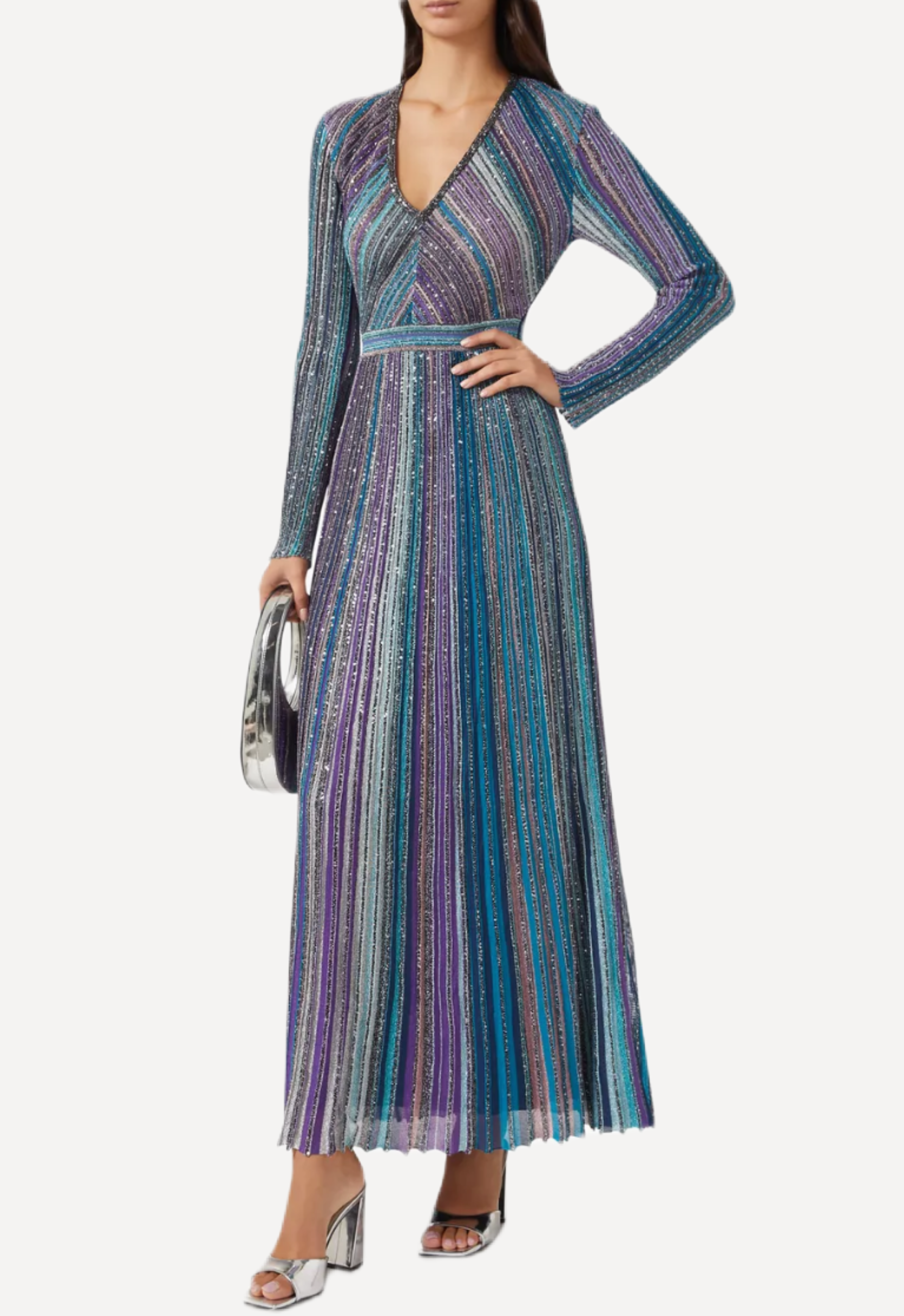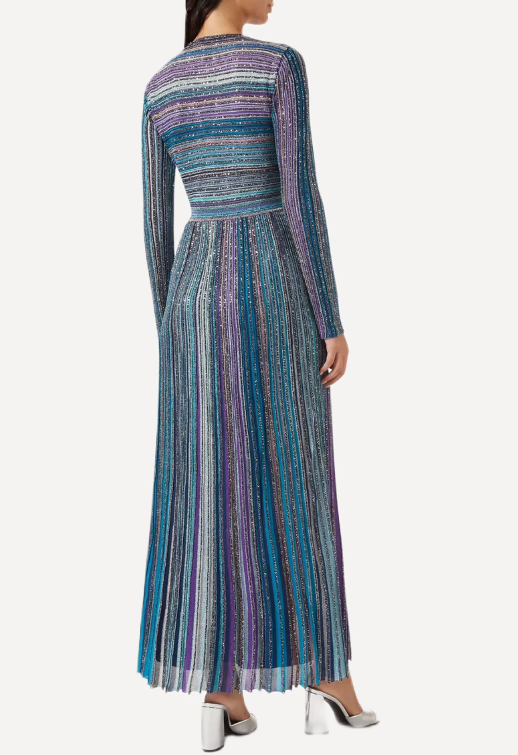 This signature Missoni maxi dress captures the house’s iconic artistry with shimmering multicolor stripes woven in a refined metallic knit. Designed with a flattering V-neckline and long fitted sleeves, the silhouette is gently defined at the waist before flowing into a softly pleated skirt that moves beautifully with every step. The harmonious blend of turquoise, violet, and silver tones creates a luminous effect, while the lightweight fabric offers both comfort and graceful drape.