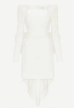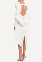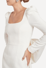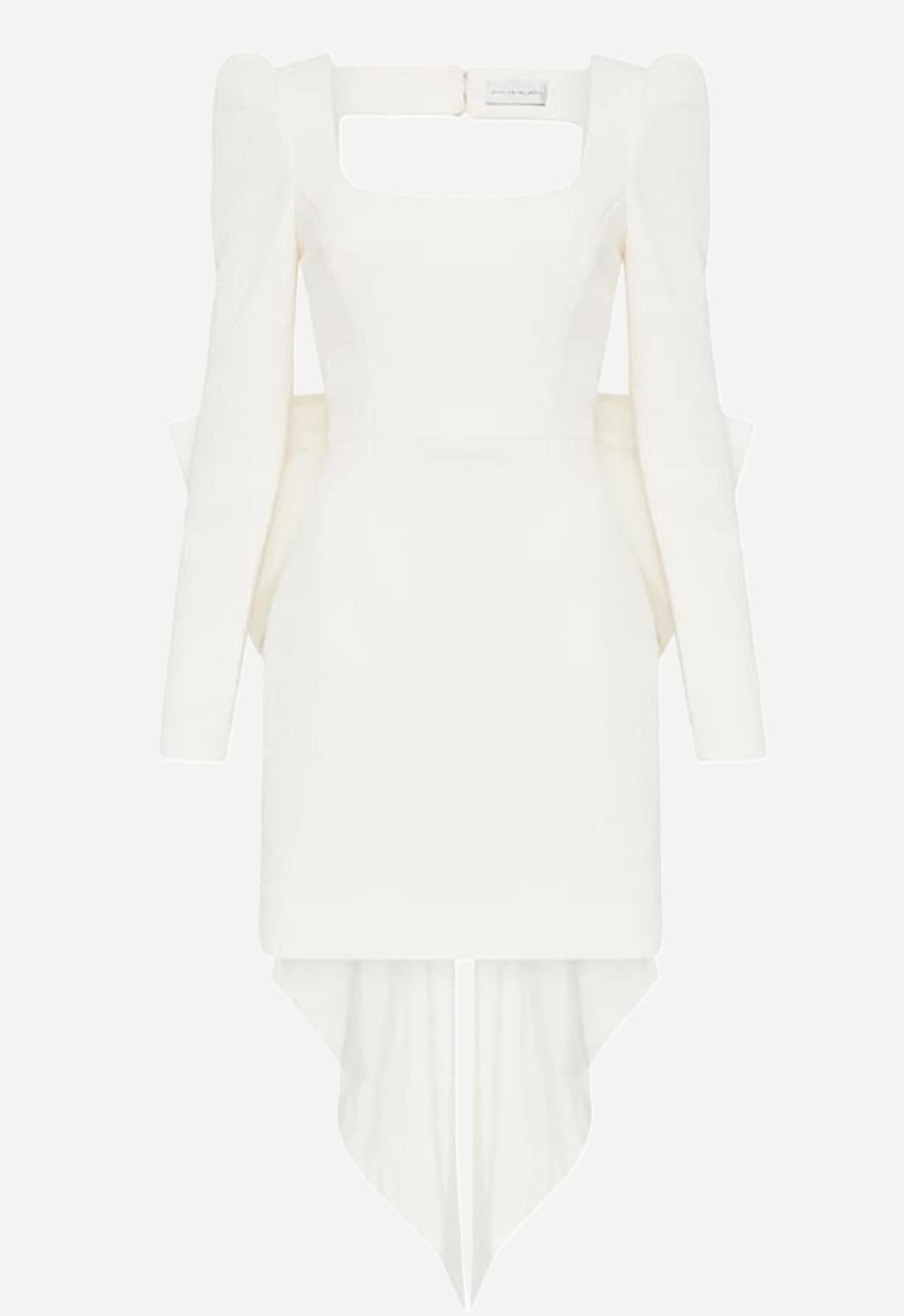The Monique Mini crafted from a textured crepe features long sleeves with pleated structured shoulders and a statement bow at the back.