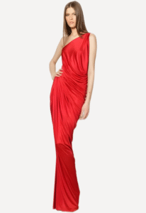 This midi dress by Donna Karan in a striking red features ruching along the sides, sculpting a flattering silhouette. The one-shoulder adds a touch of elegance, while the length exudes sophistication.