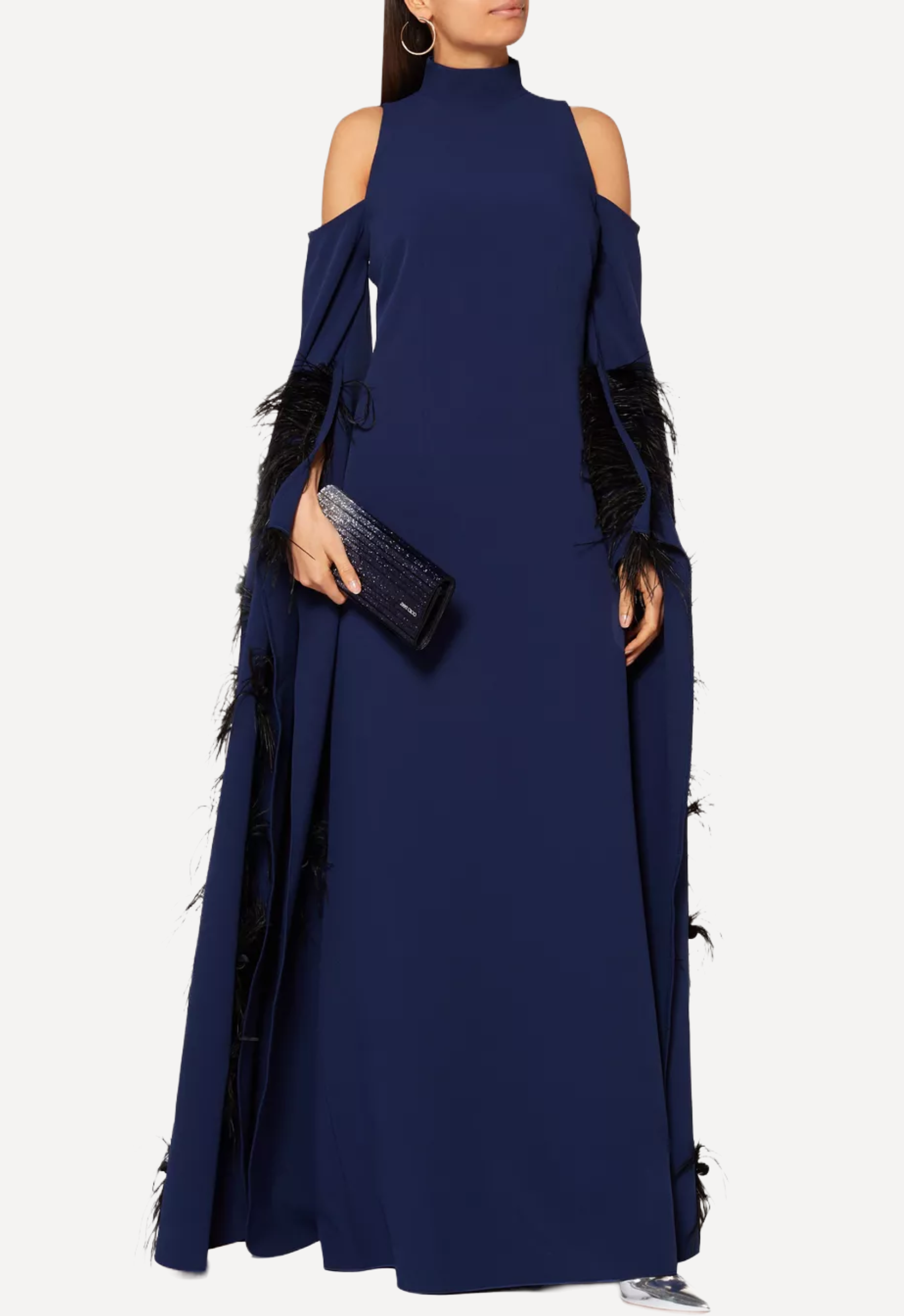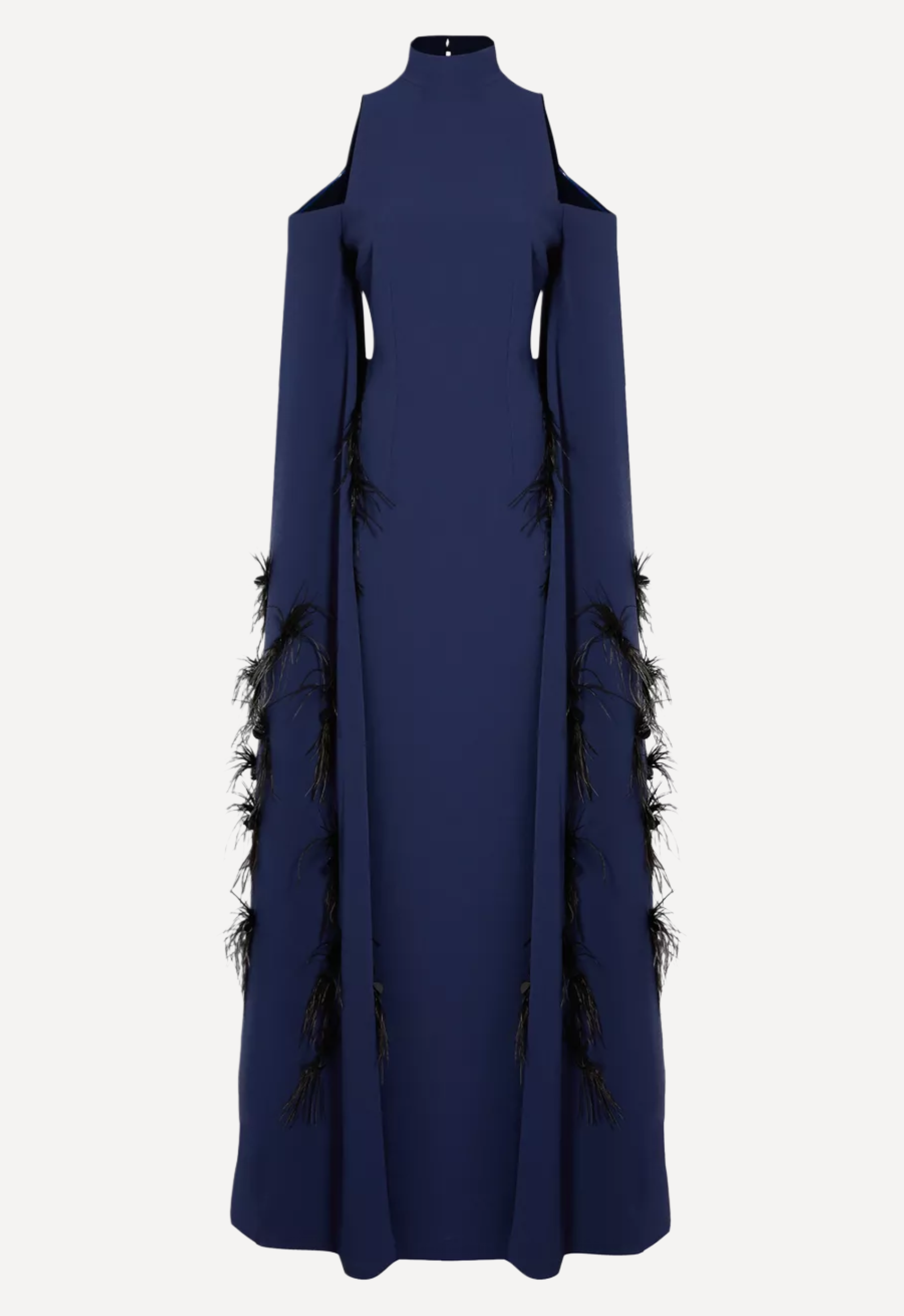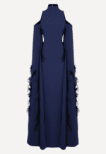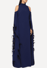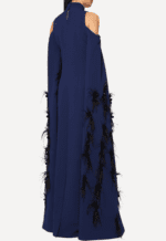 A striking piece by Safiyaa, this elegant navy gown exudes modern sophistication with its sculptural silhouette and refined detailing. Designed with a high neckline and open-shoulder cutouts, it balances structure and allure, while the elongated sleeves cascade dramatically with subtle feather trims for added movement and texture. The fluid, floor-length shape creates a graceful, streamlined look, making it an effortlessly statement-making choice for formal evenings or special occasions.