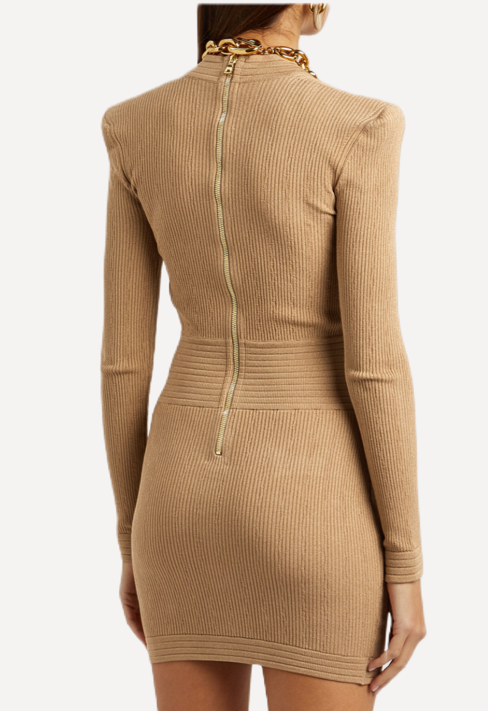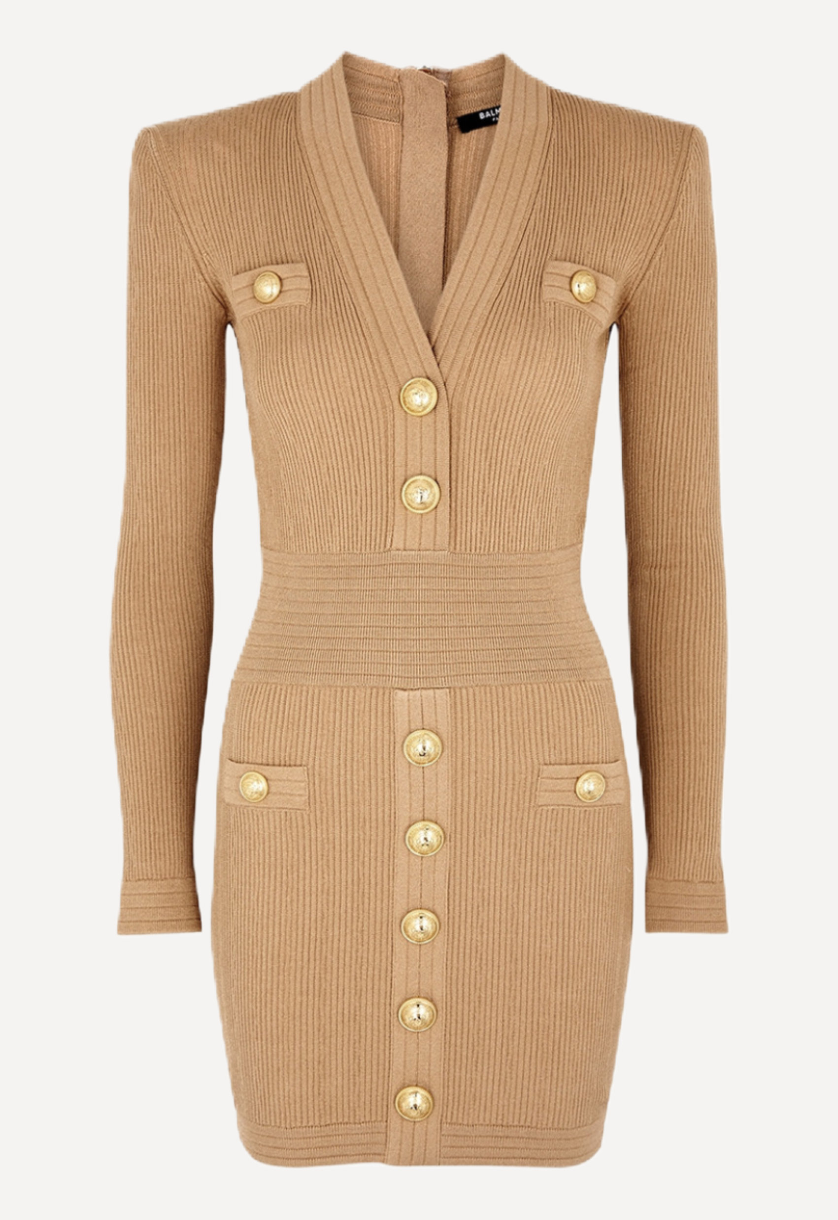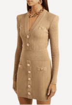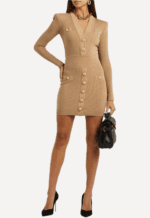 Striking a perfect balance of structure and sensuality, this Balmain mini dress is crafted from a ribbed stretch-knit fabricthat sculpts the figure with the house’s signature precision. The design features a sharply defined V-neckline and strong, tailored shoulders that echo Balmain’s iconic power-dressing aesthetic.