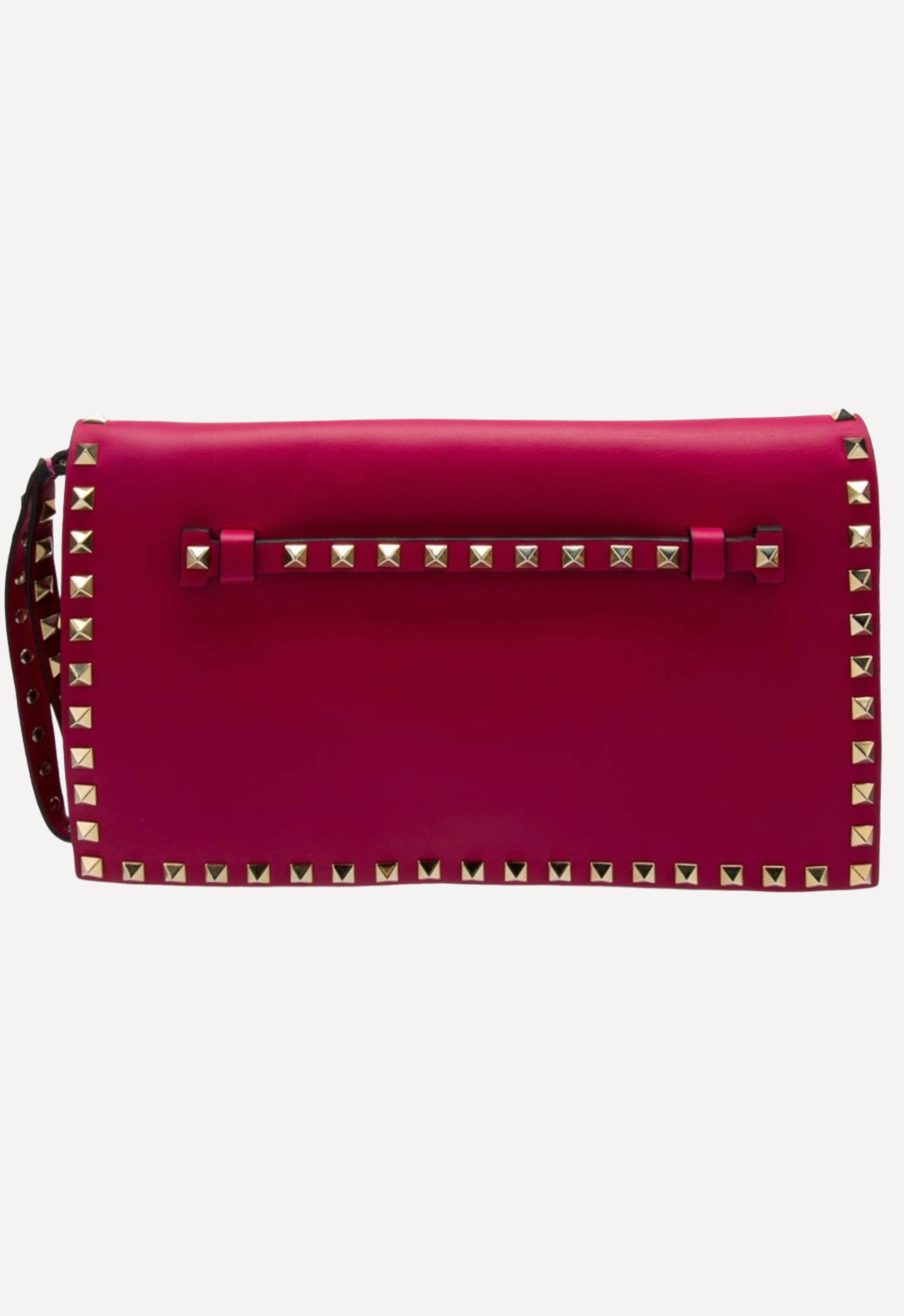 This Valentino Rockstud Clutch made from smooth leather in a hot pink features rockstud accents, silver-ton hardware, a flat handle & wrist strap, leather lining, a single interior pocket and a snap closure at front.