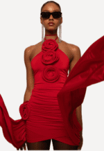 The Red Floral Applique matching set features a two rose-detailed mini skirt with long ties that drape down to the ground and a three rose detailed top with straps that wrap around the neck.