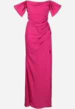 This drop-shoulder evening gown from Guiseppe Di Morabito features ruched detailing, a square neckline, rear zip fastening, two thigh-high side slips and a straight hem.