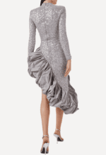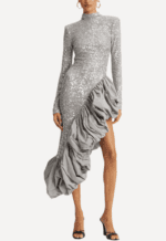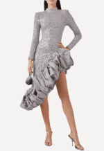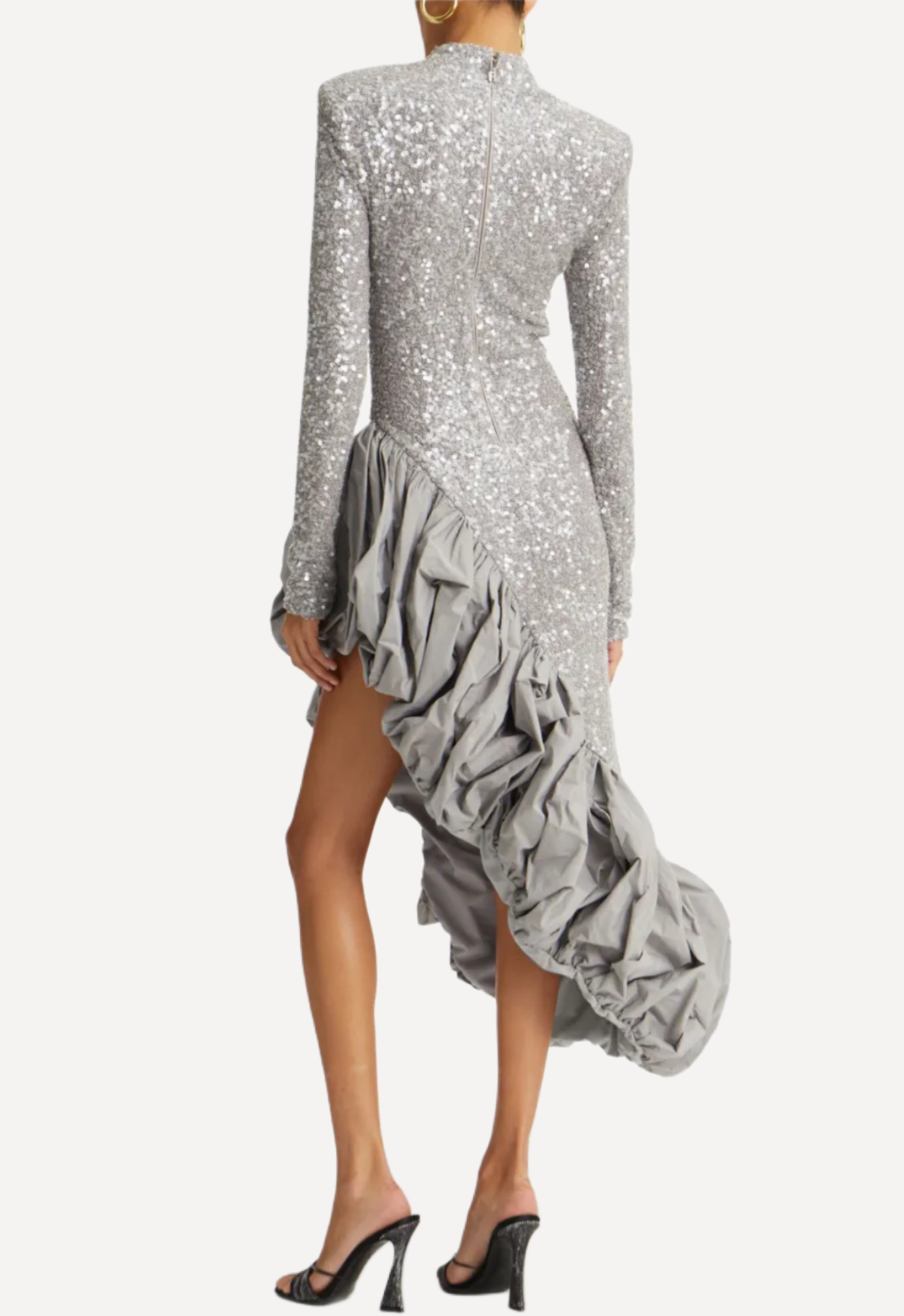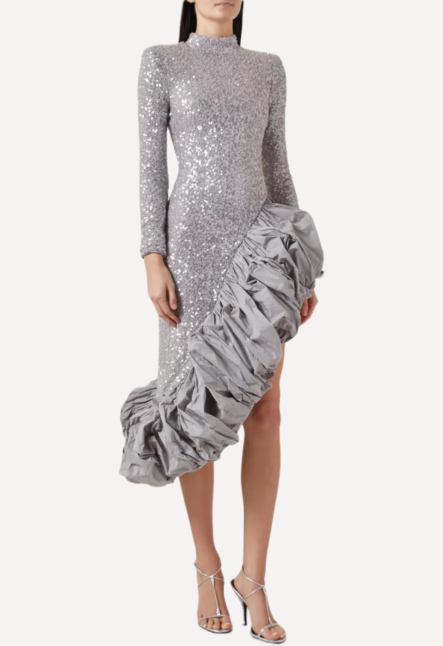 This Rotate dress features sequin-embellishments, designed to command attention at every celebration. Thousands of radiant sequins illuminate the silhouette, reflecting light with every movement for an irresistibly glamorous effect. The contemporary mock neckline lends refined elegance, while the bold asymmetric hemline introduces a dynamic, fashion-forward twist. Expertly crafted to flatter the figure and ensure effortless comfort, this striking design is the perfect fusion of modern sophistication and after-dark allure—made for unforgettable entrances and equally memorable moments.