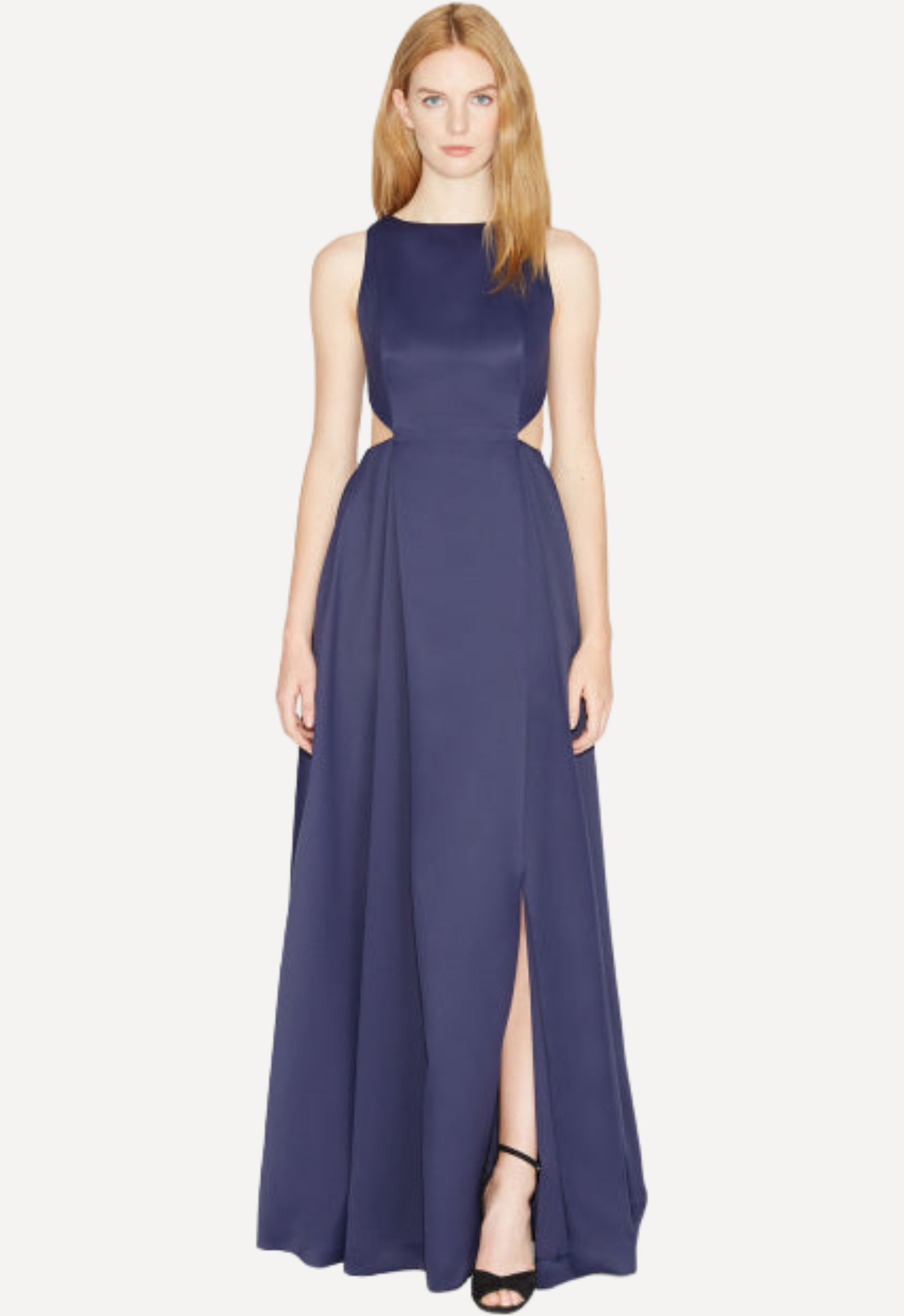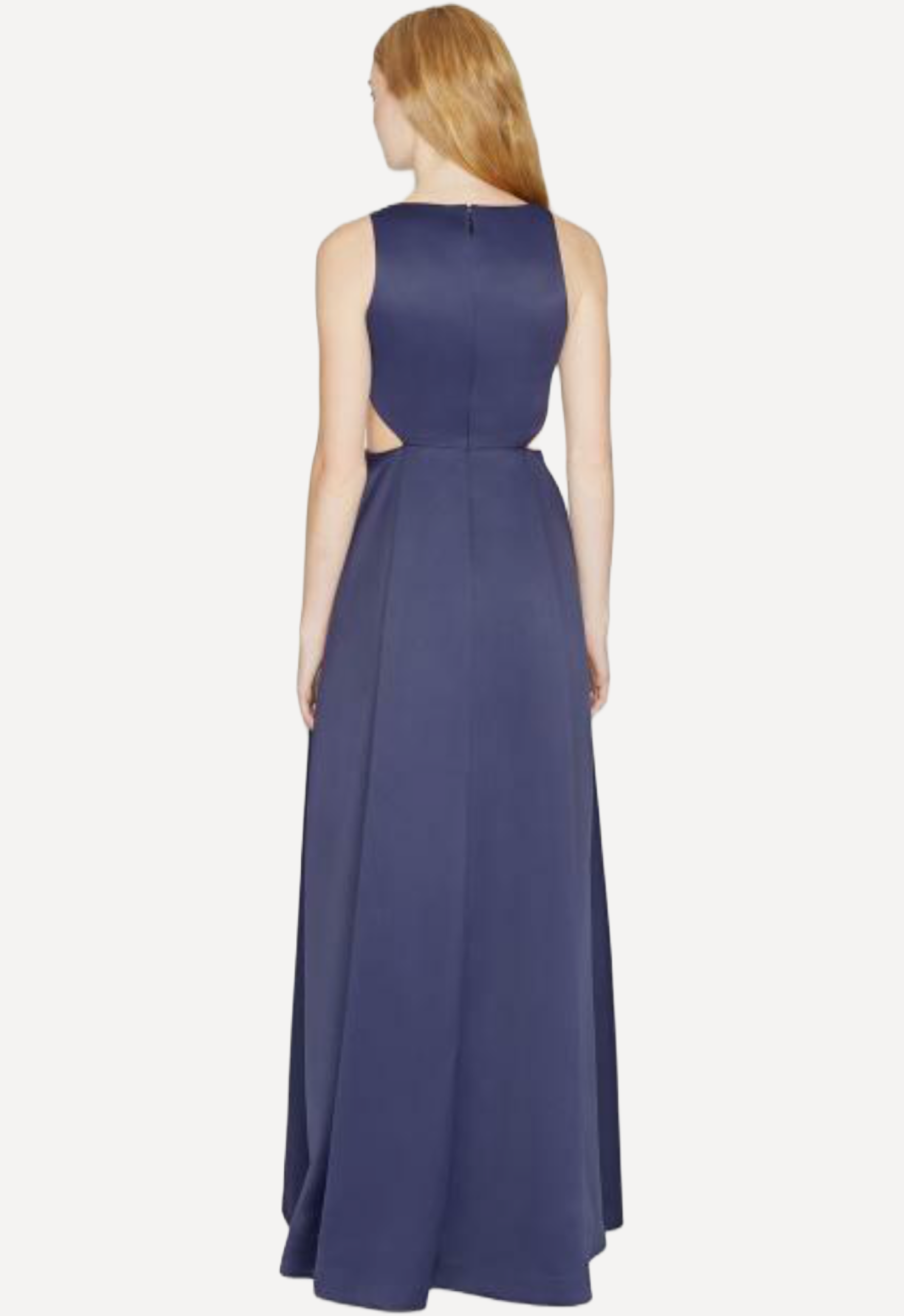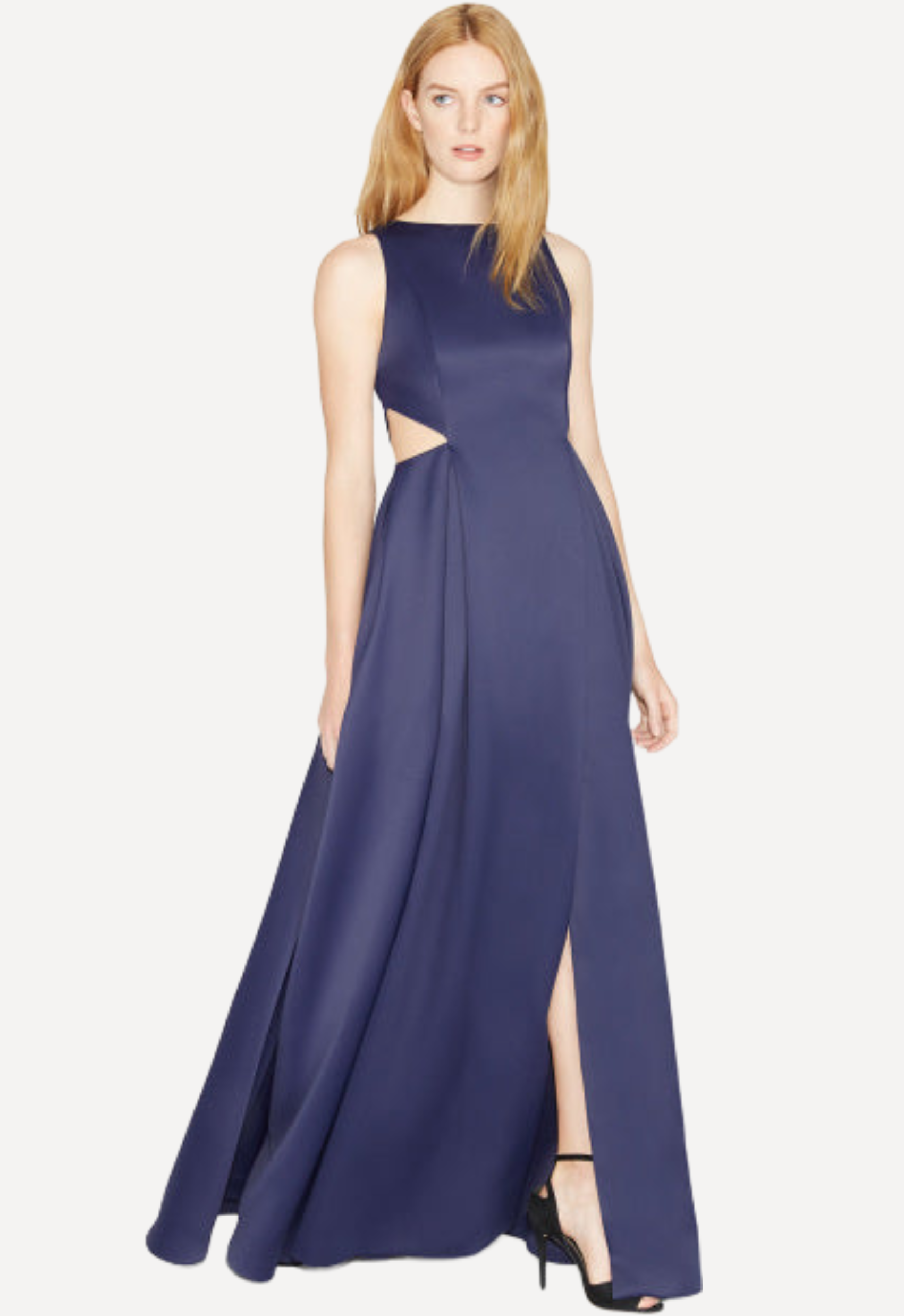 This Halston Heritage gown features a sleeveless silhouette with modern waist cut-out detailing, creating a bold yet elegant look that highlights the figure with effortless sophistication.