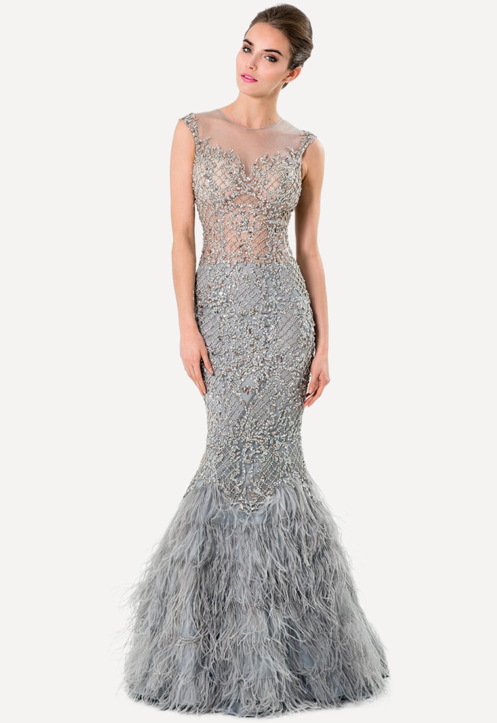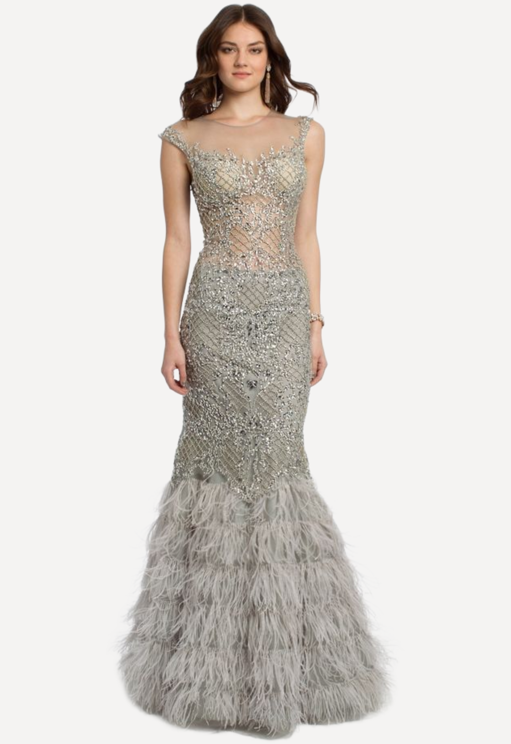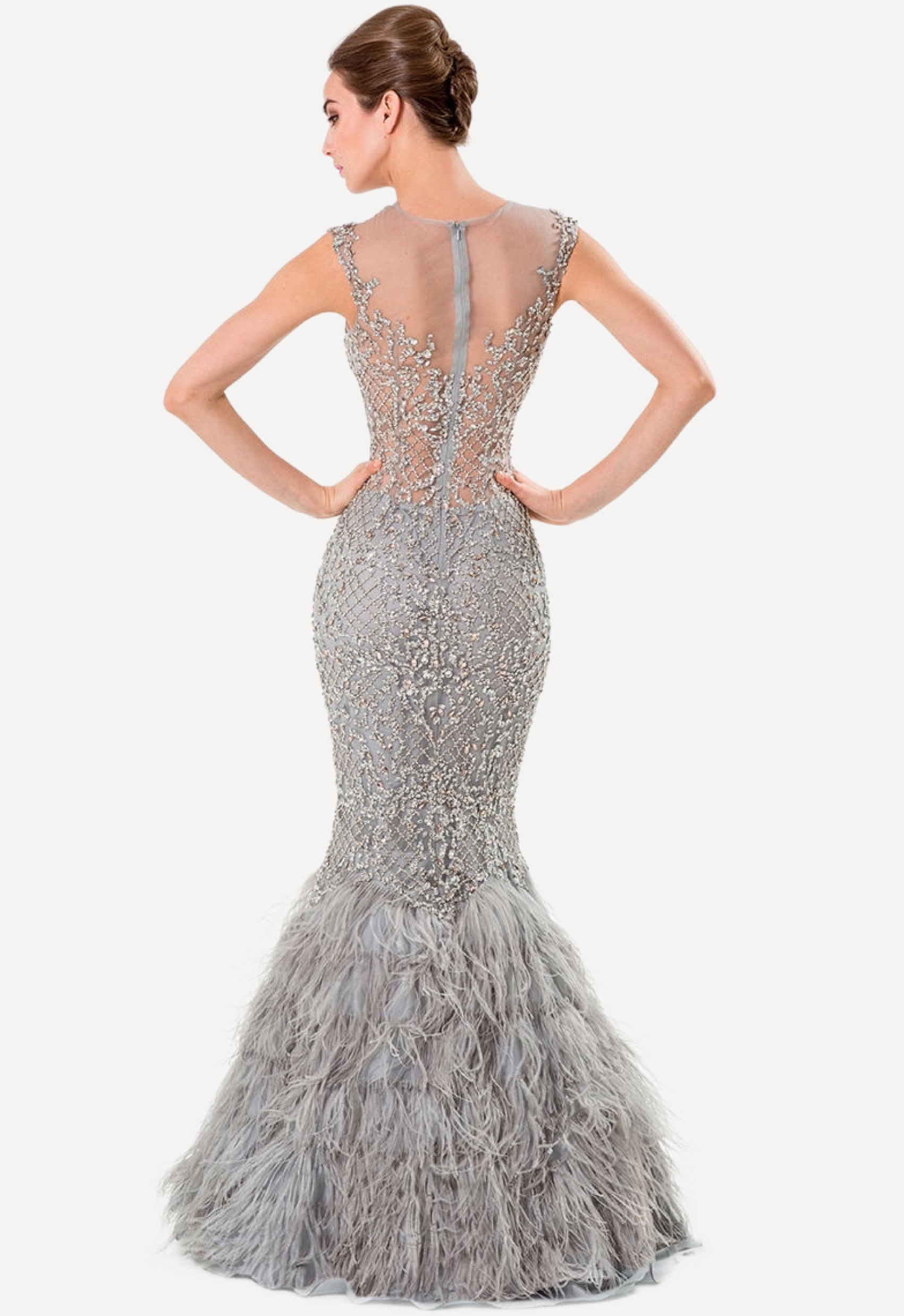 This sequined gown by Terani Couture features a stunning illusion neckline, crystal embellishments and a feather mermaid hem.