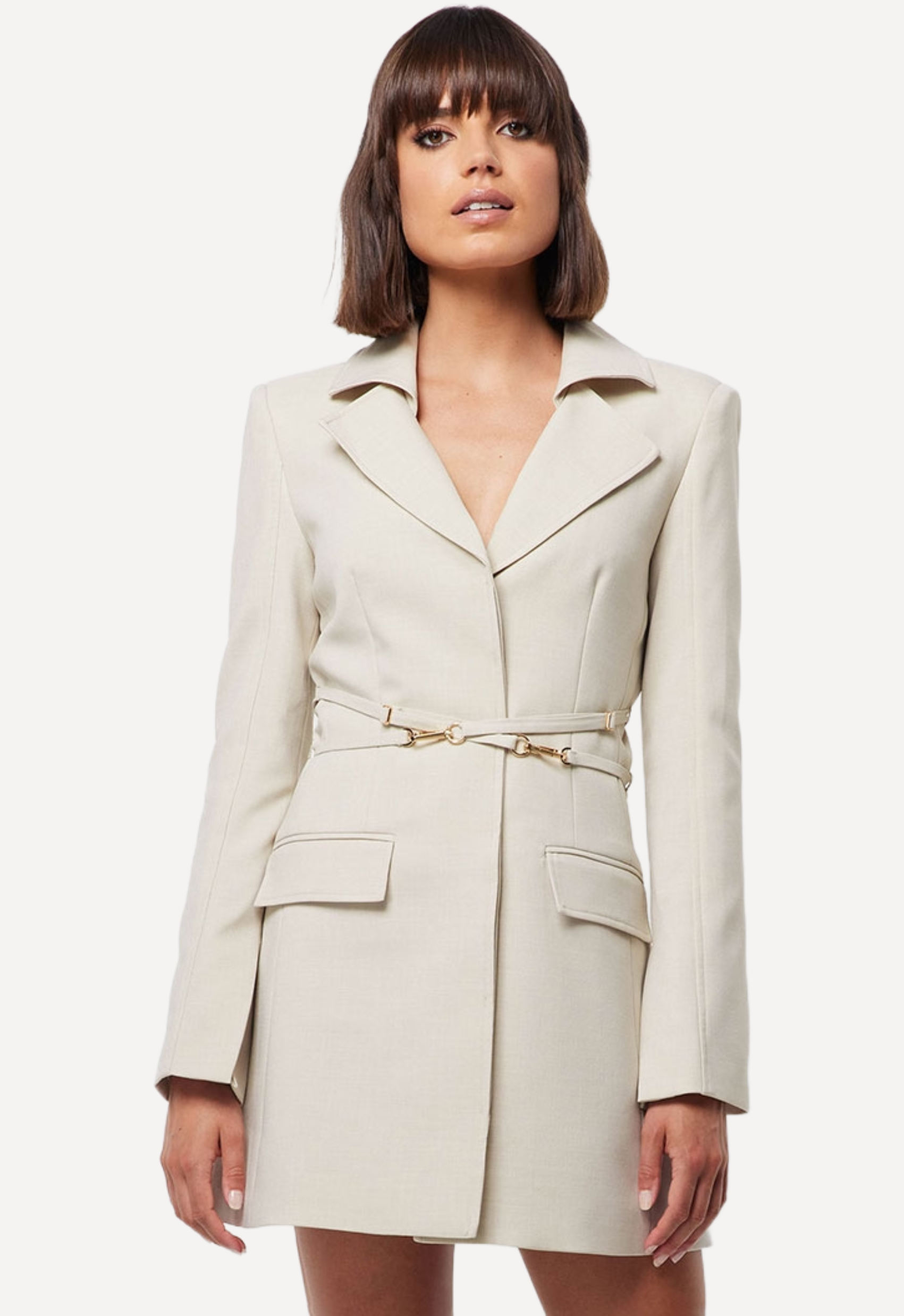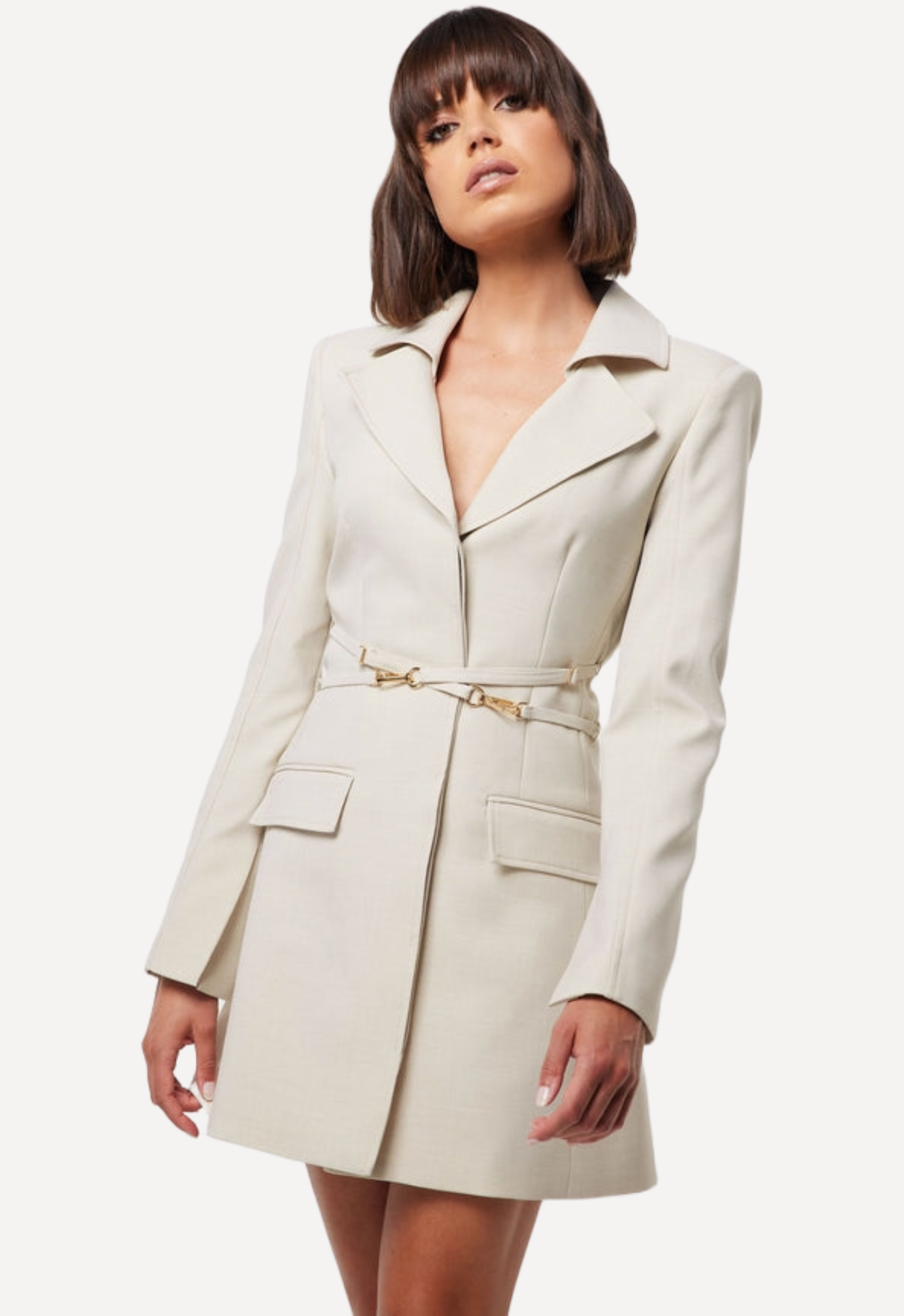 This dress offers a structured collar, a concealed button through front and long sleeves. It also includes gold clip closures across the waist add a contemporary twist to this refined, light creme design.