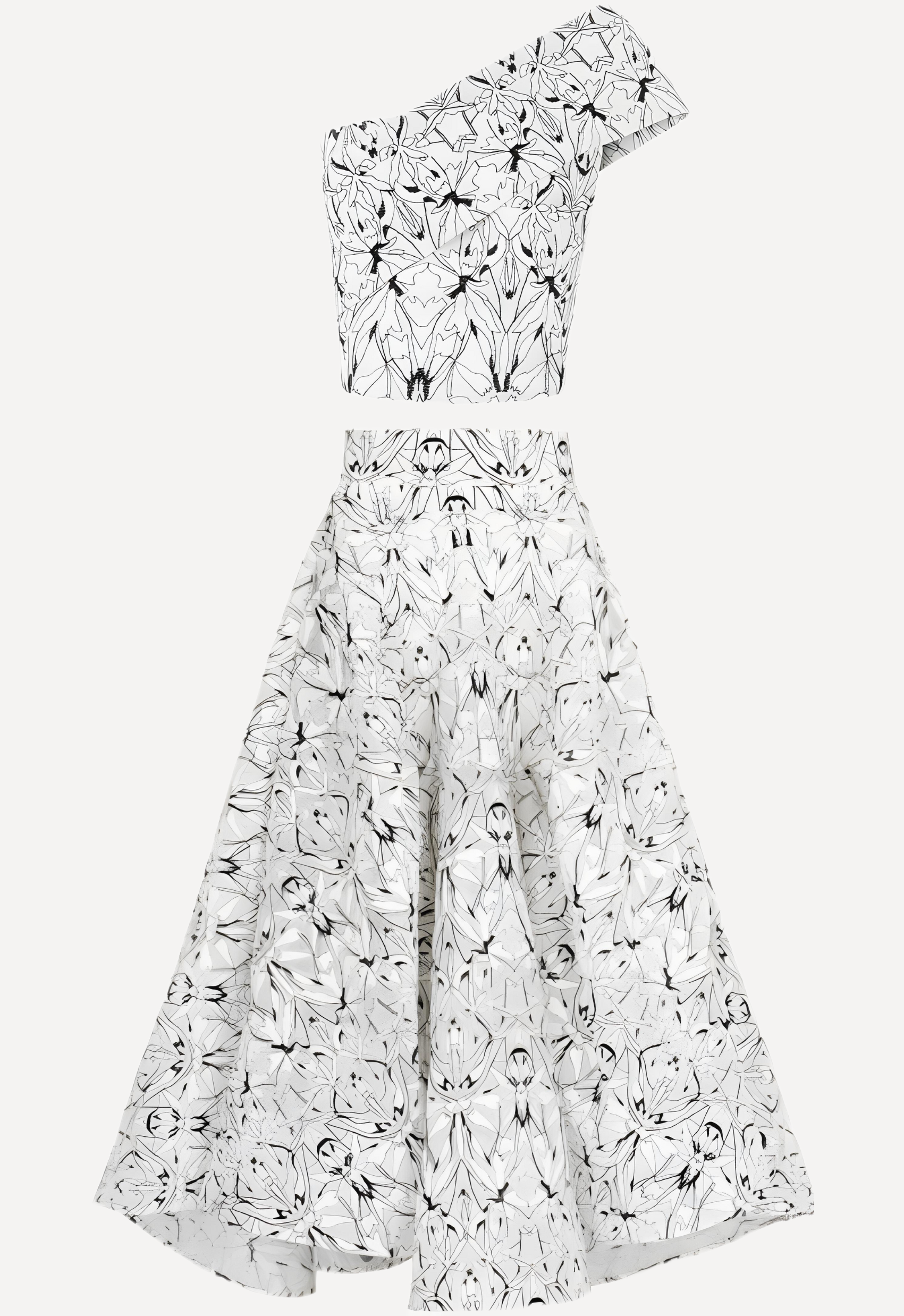 The Spider Orchid matching set includes a striking skirt composed of contemporary embroidered mesh with tulle underskirts for a sculptural finish as well as a coordinating bustier to complete the look.