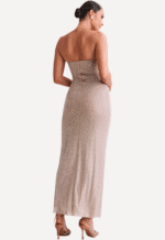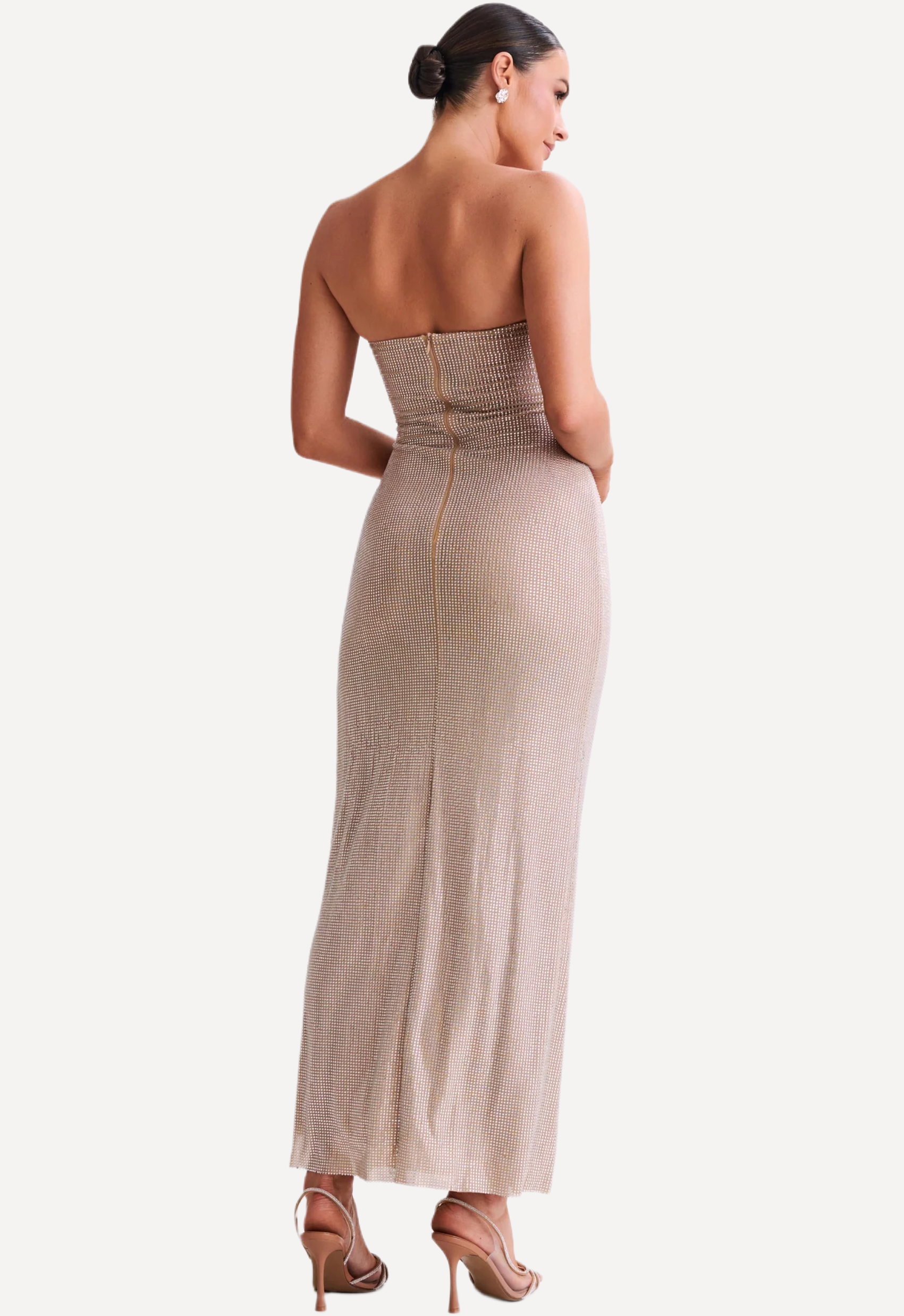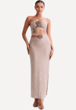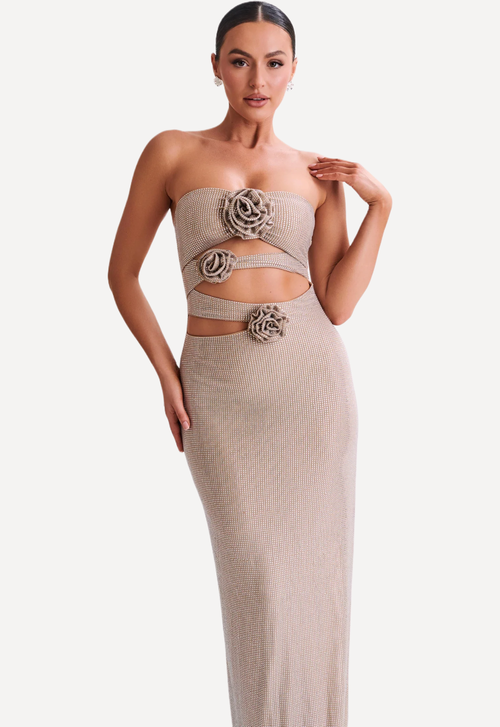 The Stassie Rose Diamante dress features a strapless neckline, straight hem, and cut-out front details designed with rose ornament.