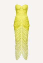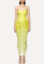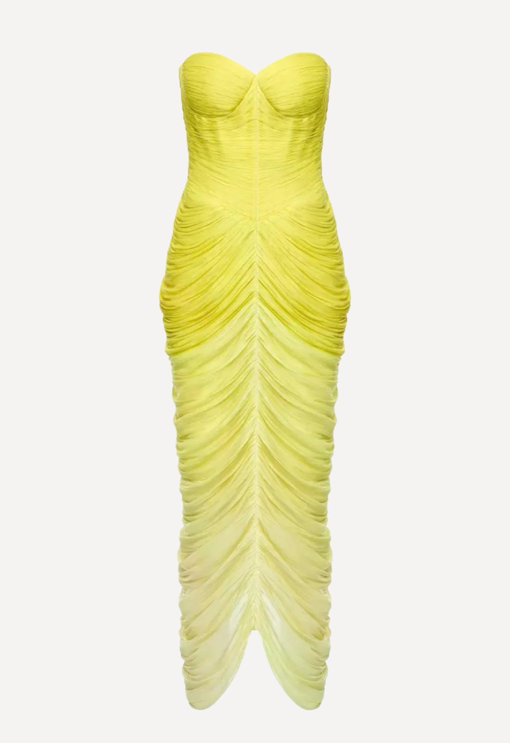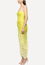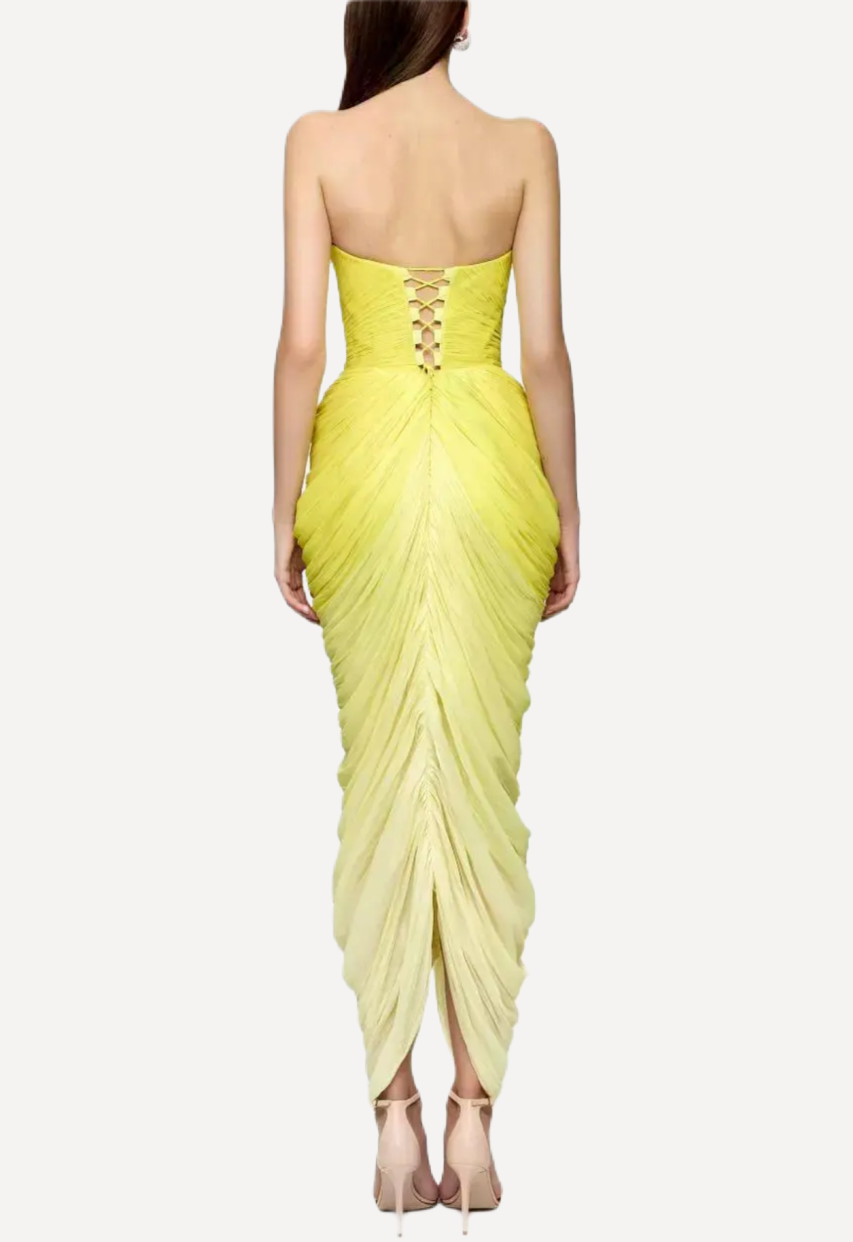 Radiant and ethereal, the Ana Radu Strapless Draped Maxi Dress captivates in a luminous yellow ombre that transitions seamlessly through sunlit tones. Designed with a romantic sweetheart neckline, the strapless silhouette highlights the décolletage with effortless femininity.