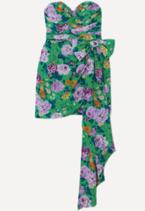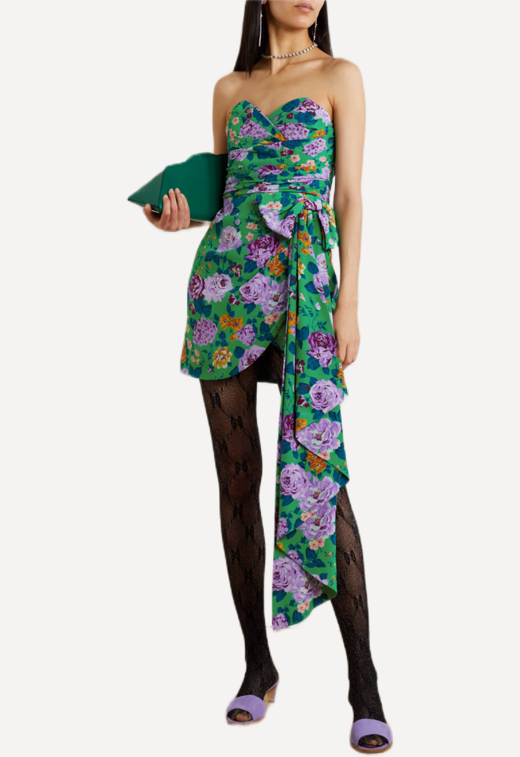 This strapless mini dress features a blend of purple and green hues with floral print, and the highlight of the draped silk dress is the bustier bodice and the dramatic bow on the front.