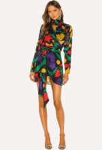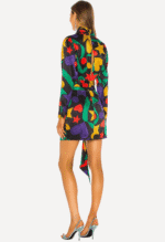 The Yarden Mini Dress by Ronny Kobo showcases a vibrant multicolor shape design on luxurious Jacquard fabric and features a draped detail and a back keyhole with a button closure.