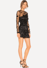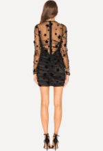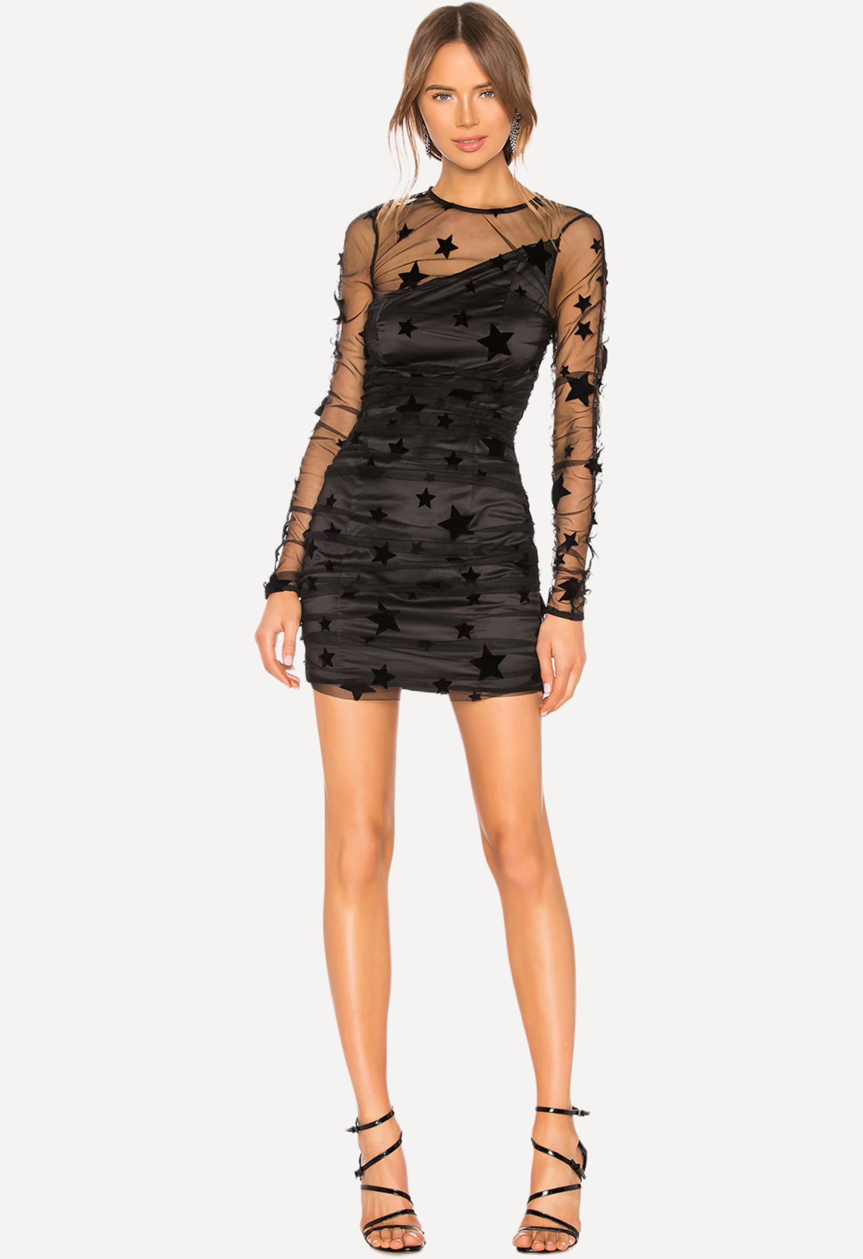 H:OURS Mini Black Dress, featuring sheer mesh fabric with felt applique star detailing and allover ruching for a flattering, body-skimming silhouette.